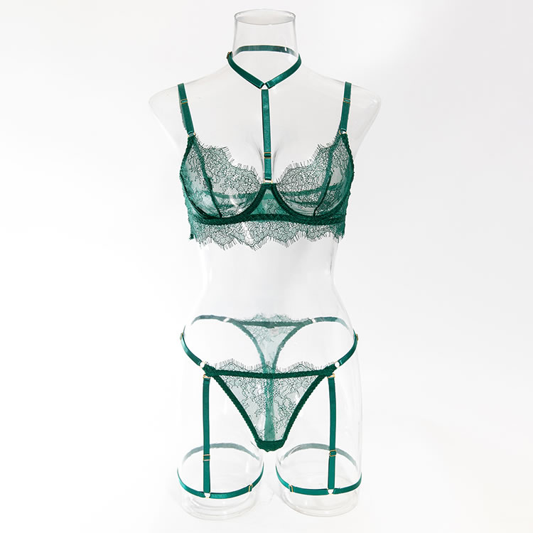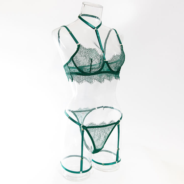 Indulge in the seductive allure of this green lace lingerie set. The bra features intricate lace detailing and sheer mesh panels that provide a blend of elegance and allure. The underwire cups offer support and shape, while the adjustable straps ensure a comfortable fit. The matching thong complements the set with its delicate lace trim and center seam, making it perfect for both intimate moments and special occasions.