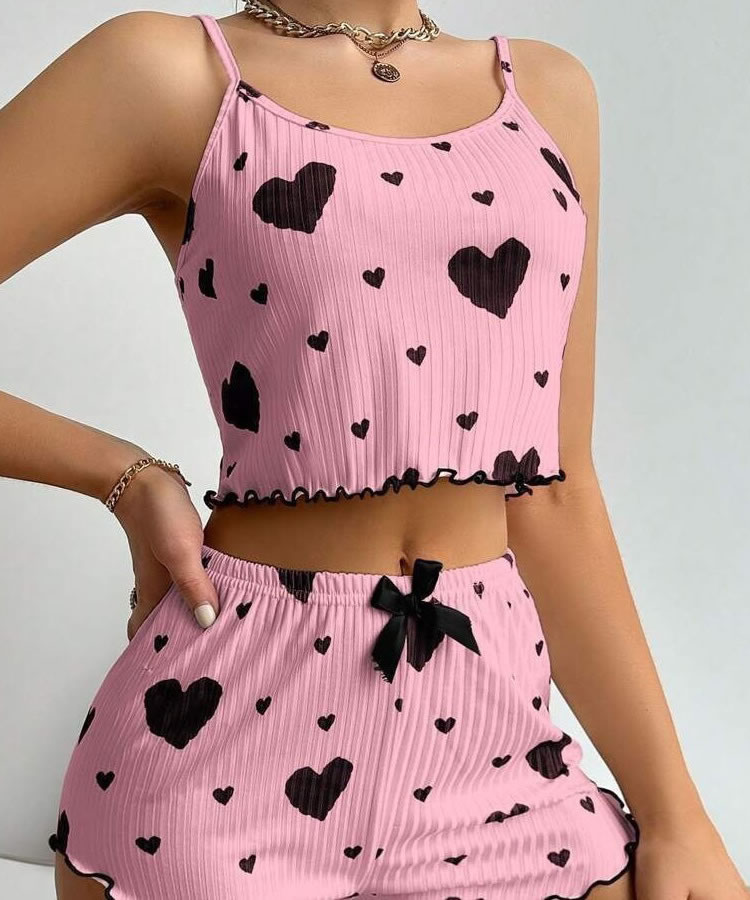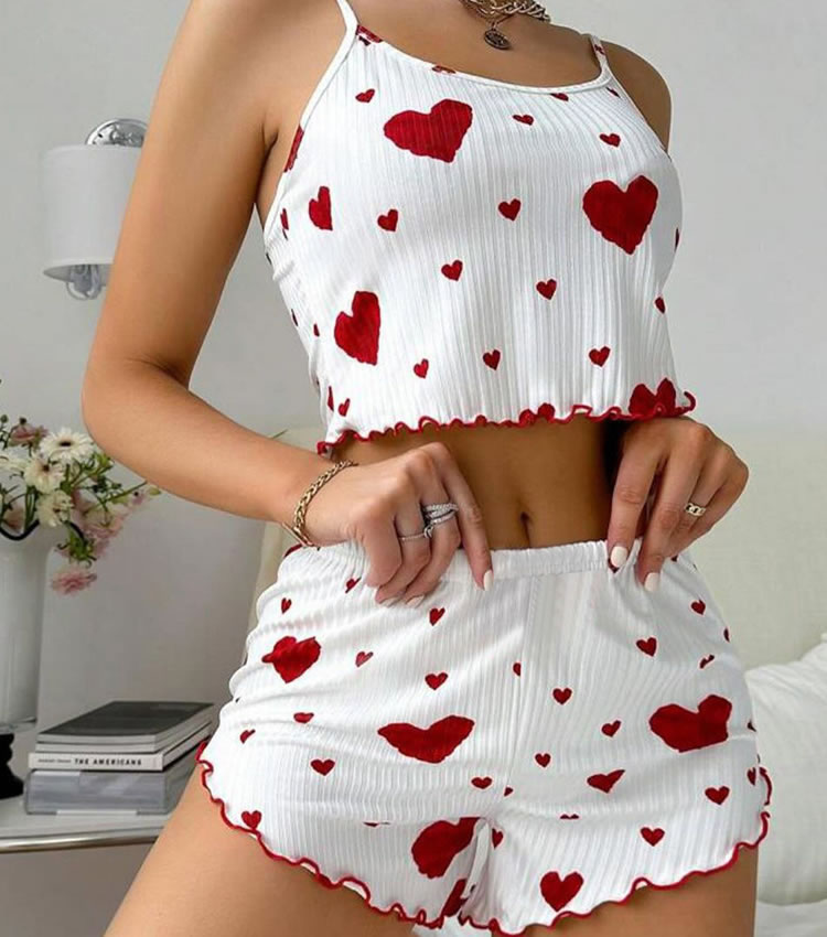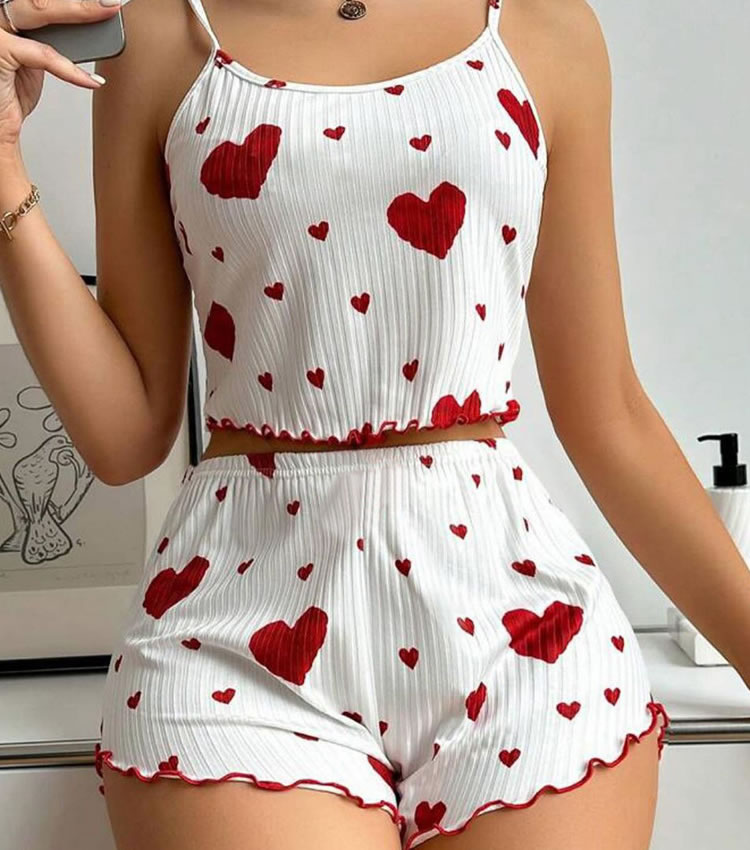 This charming heart print cami and shorts set features a playful design with red hearts scattered across a white background. The ruffled edges on the cami and shorts add a touch of femininity, while the ribbed texture ensures comfort. Perfect for those who want to feel cute and cozy.