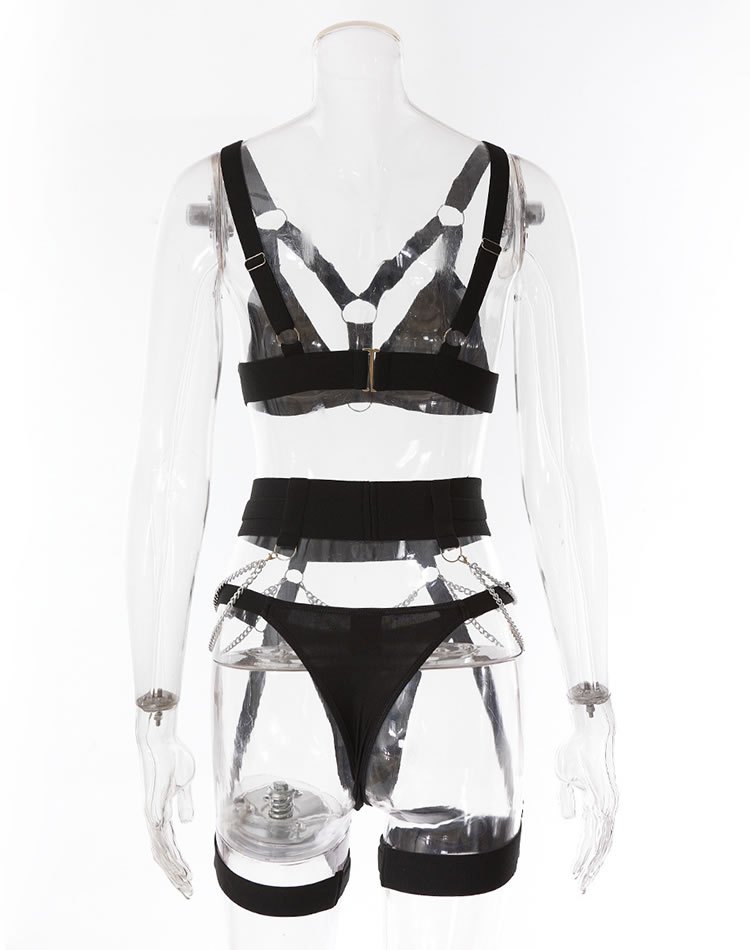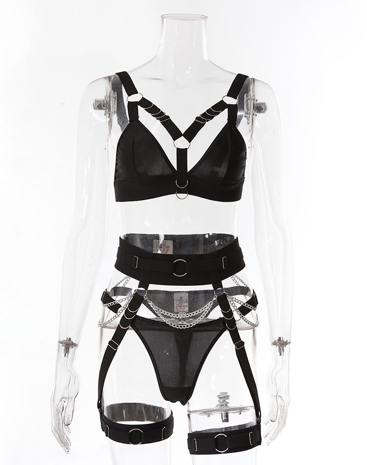 Strap in for a good time in this sultry bra set featuring triangle cups, a strappy neckline with an O-ring accents, adjustable spaghetti straps, a hook back closure, a matching garter belt with adjustable garter straps, wraparound leg garters, and a matching panty.