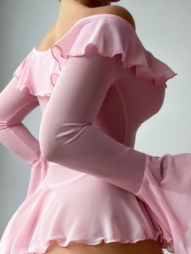 Unleash confidence and allure with this vibrant pink bodysuit. The off-the-shoulder neckline, ruffled details, and playful fit enhance your curves, while the bell sleeves create a dramatic, eye-catching look for unforgettable nights.