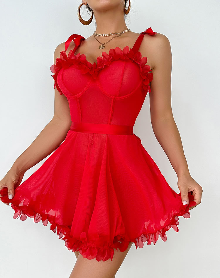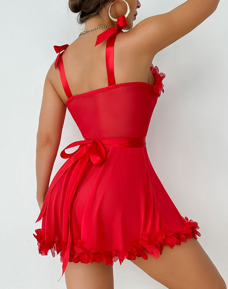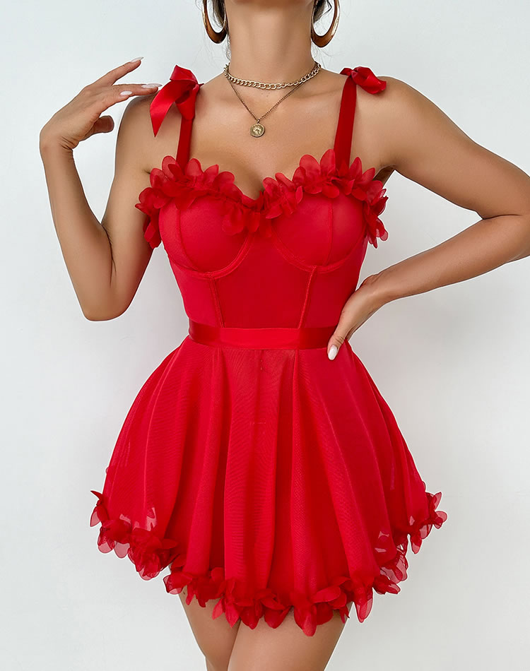 This vibrant red babydoll features a captivating floral design with 3D flowers adorning the bust and hem, creating a playful and feminine look. The tulle skirt adds volume and movement, while the adjustable straps ensure a comfortable fit. Perfect for those who want to make a statement in their lingerie.