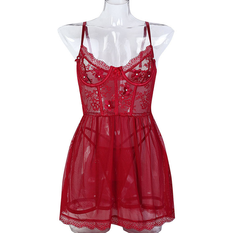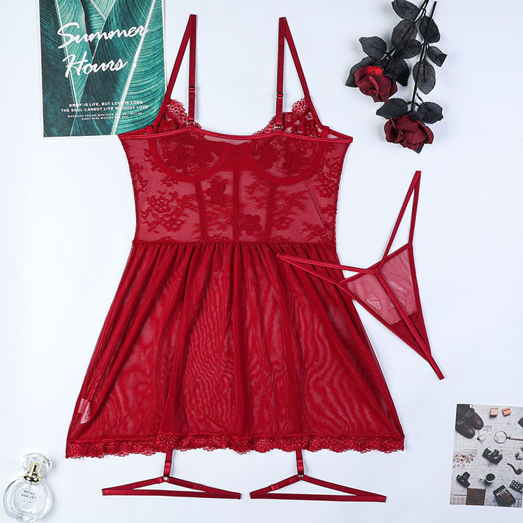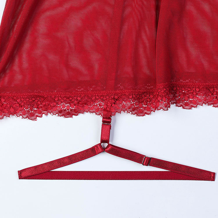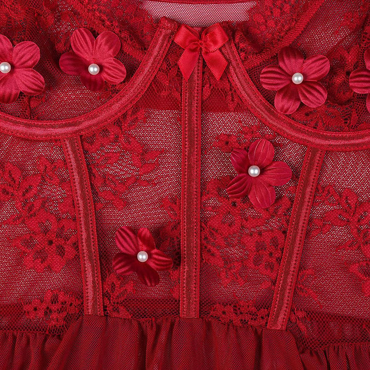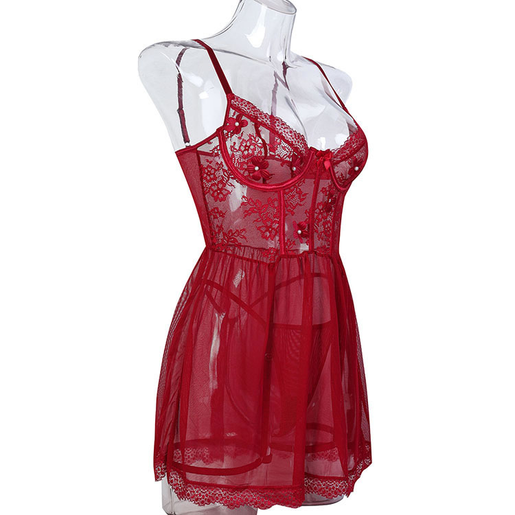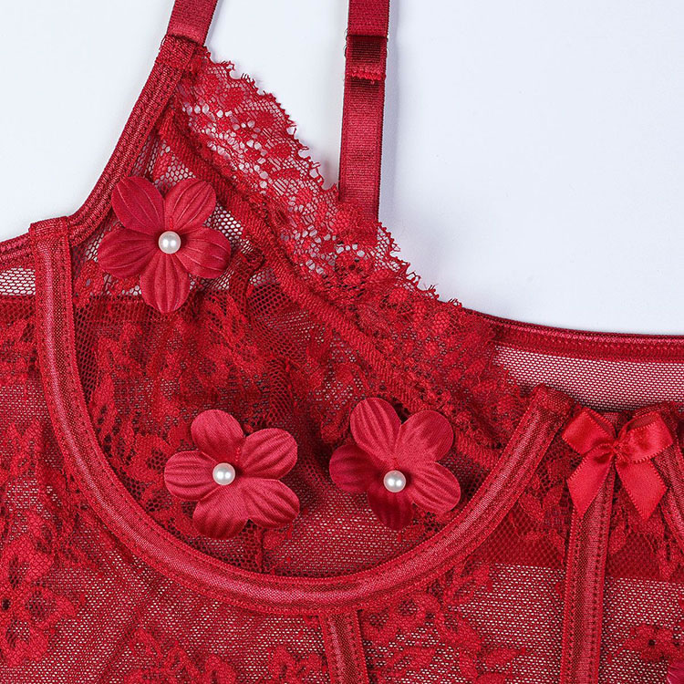Elevate your intimate moments with this stunning red lace lingerie set. The bralette features intricate floral lace detailing and pearl embellishments, while the sheer overlay adds a layer of allure. Adjustable straps ensure a comfortable fit, and the garter belt adds a touch of sophistication.
