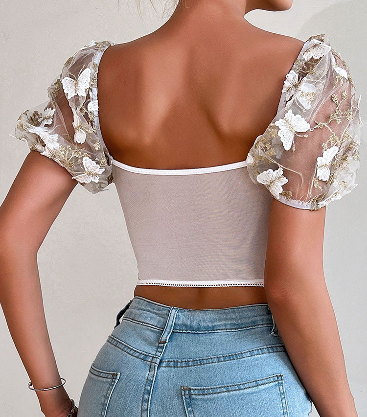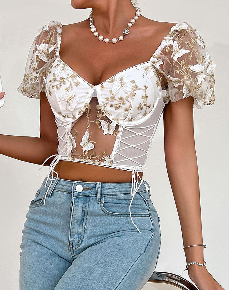 Stand out with this stunning white embroidered corset top. The combination of soft sheer mesh fabric, intricate butterfly and floral embroidery, and side lace-up design creates a bold and elegant look. The customizable fit makes it versatile for various styles.