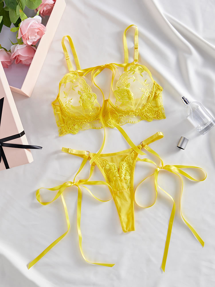 Elevate your intimate wardrobe with this elegant yellow lace intimates set. The bra is crafted from high-quality sheer mesh with detailed floral embroidery, offering a seamless blend of sophistication and allure. The underwire cups provide support and shape, while the intricate lace detailing adds a touch of glamour. The high-waisted panty features sheer mesh and lace accents, ensuring both comfort and style. Ideal for both everyday comfort and romantic evenings.