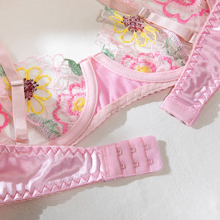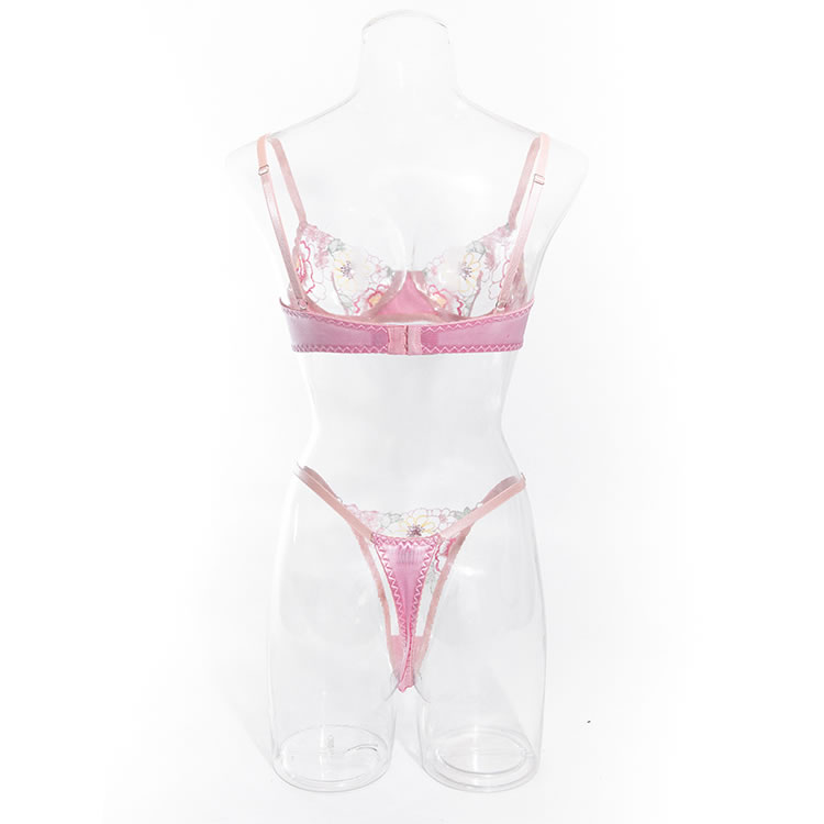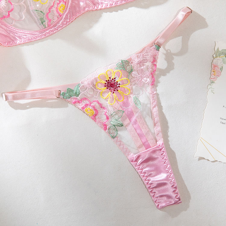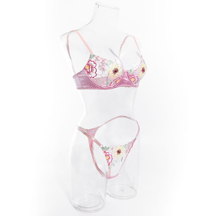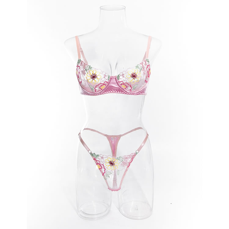 Transform your boudoir into a floral paradise with this alluring mesh bra set. Designed with sheer mesh underwire cups adorned with beautiful floral embroidery, it combines elegance with seduction. Adjustable spaghetti straps and a hook and eye back closure ensure a comfortable fit, while the matching thong panty adds a playful finishing touch. Perfect for making a statement, this set will bring a touch of romance to your intimate collection.