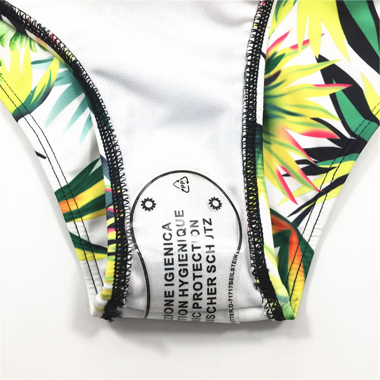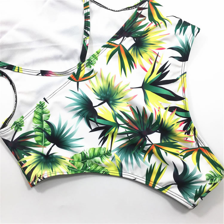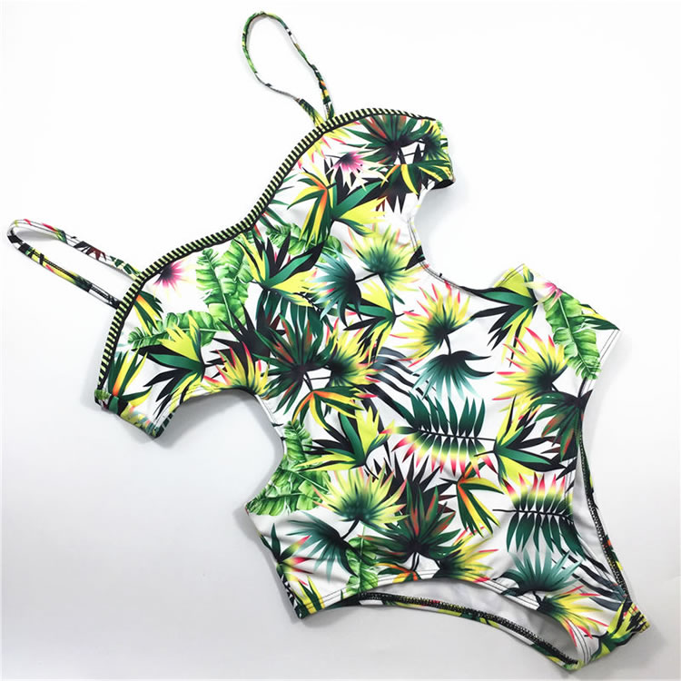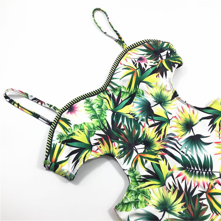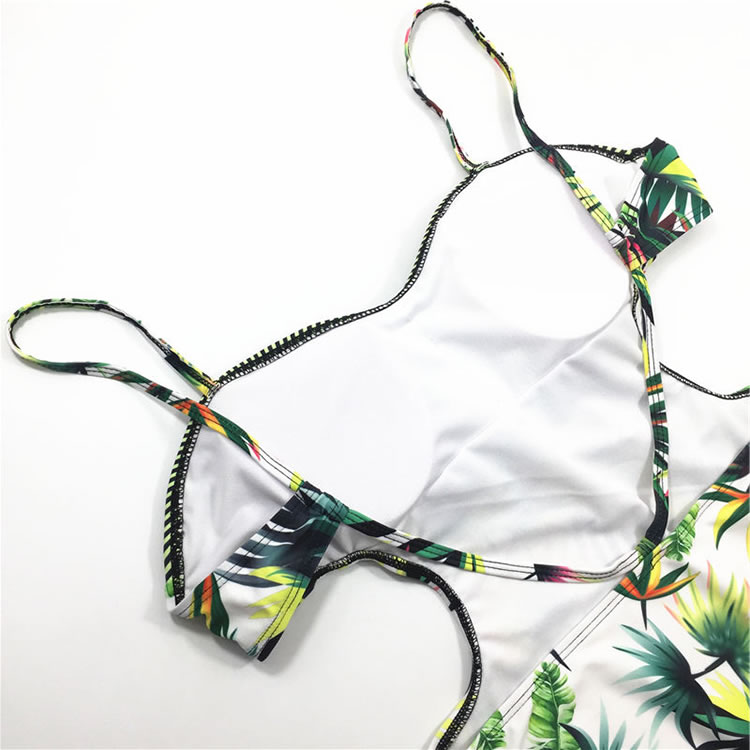 Be a beach bum in this flirty bikini swimsuit featuring a colorful leaf print, a sweetheart neckline, spaghetti straps, side cut-outs, and a cheeky cut back.