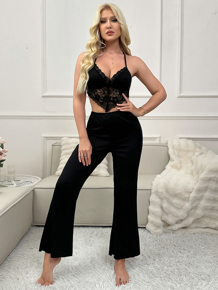 Make cozy look fabulous with this flirty pajama set. It features a cropped bralette top with soft cups, a sheer lace underbust, halter straps, and a string tie back closure. The matching pants come with an elastic waistband and gathered cuffs for the perfect blend of comfort and style.