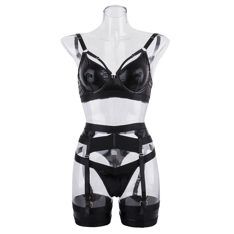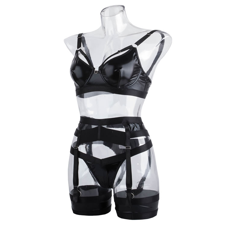 Make a bold statement with this striking black lingerie set, designed for the confident and daring. The set features a structured bra with a unique cage-like design, crafted from a sleek, faux leather material that offers a modern, edgy look. The matching high-waisted garter belt and briefs continue the theme with multiple straps and cutouts, creating a provocative silhouette. Adjustable garter straps connect to matching thigh bands, completing this powerful and alluring ensemble perfect for those who want to embrace a dominatrix-inspired aesthetic.