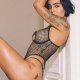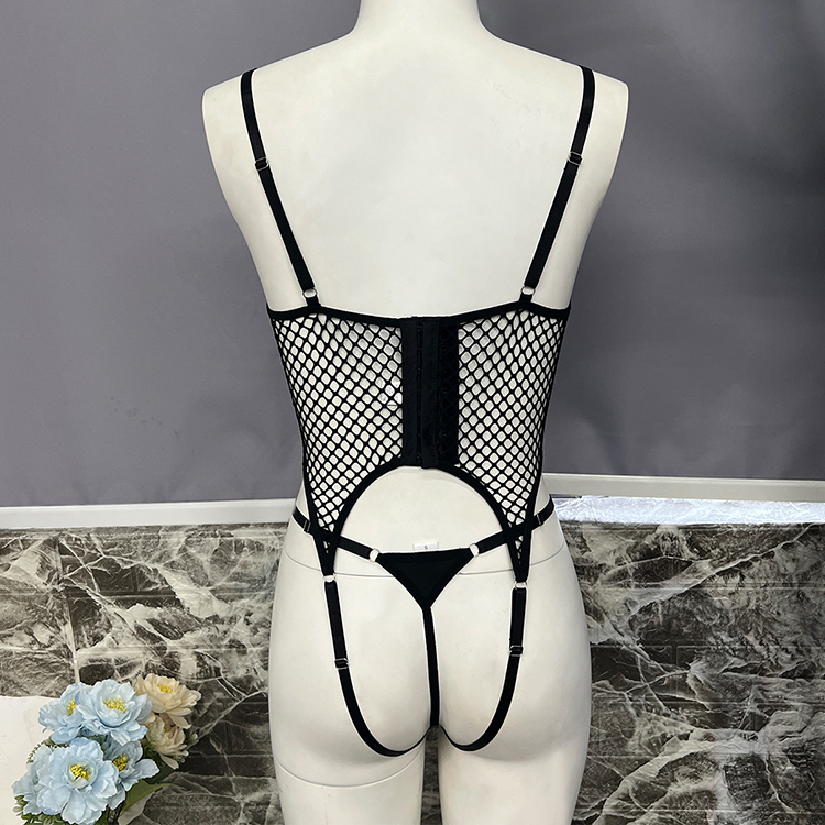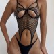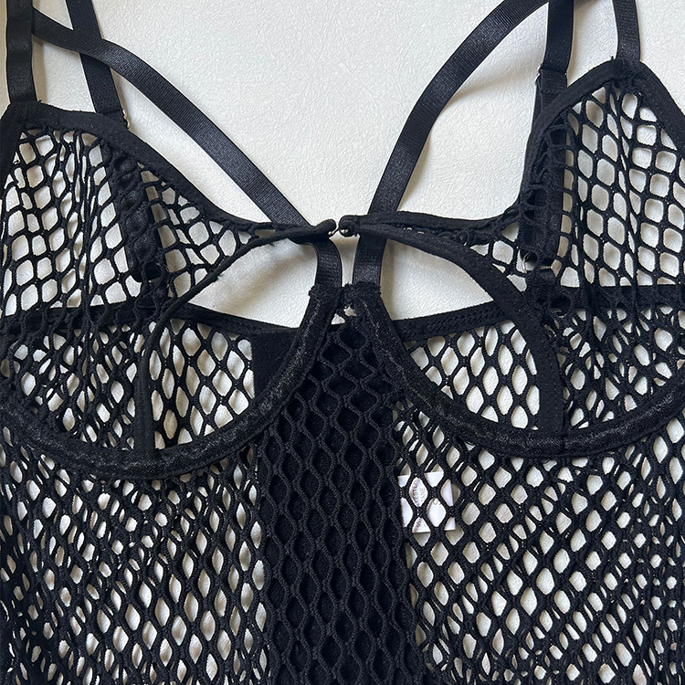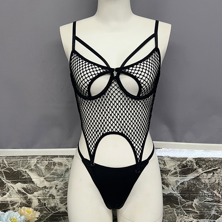 This daring two-piece lingerie features a large-scale fishnet chemises framed by smooth solid bands at the bust, waist, and hips for contrast and definition. The front showcases open cup cutouts bordered by curved straps that meet at a central clasp, creating a modern, architectural silhouette. Adjustable shoulder straps and hip clips allow you to customize fit and tension, while the thong back ensures minimal coverage with maximum impact. Perfect for those who love edgy aesthetics and wearable art in their intimate apparel.