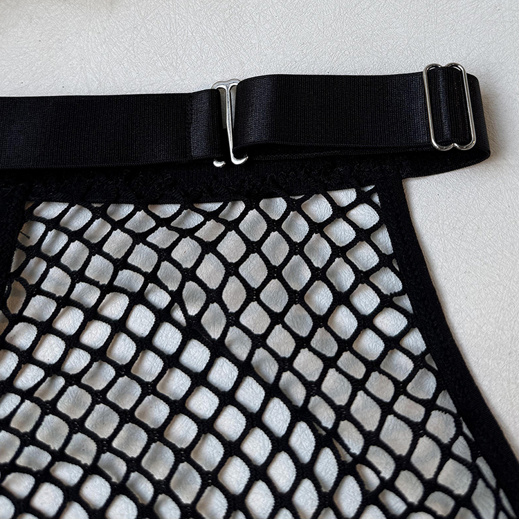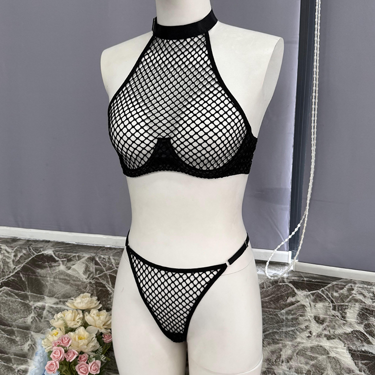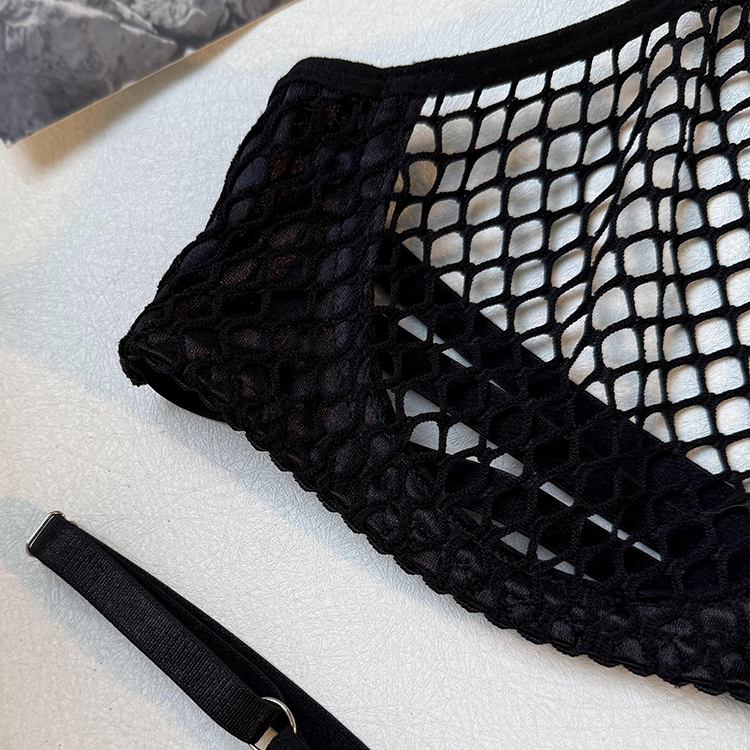 This edgy two-piece lingerie set features a halter-neck crop top made from large-scale fishnet mesh, framed by solid black trim along the bustline and neckline for definition and support. The matching thong continues the netted pattern with minimal coverage, bordered by smooth elastic edges for comfort. The back reveals three horizontal straps connected by a center hook closure, offering both aesthetic rhythm and adjustable fit. Perfect for those who love high-contrast textures and modern silhouettes in their intimate wear.