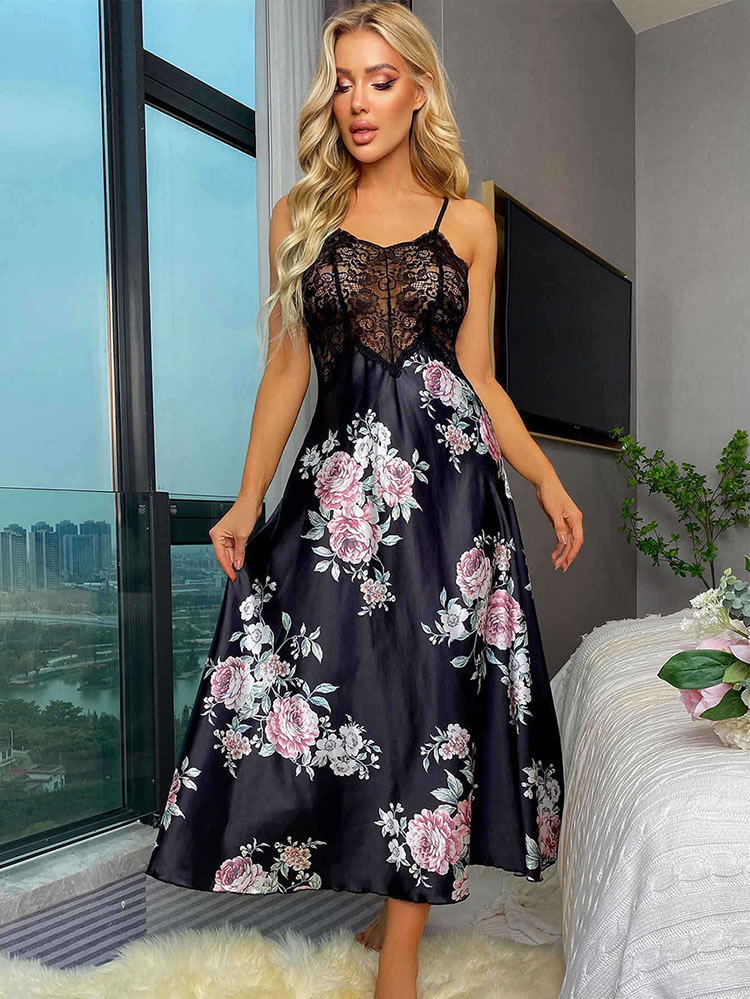 This elegant nightdress combines classic charm with modern flair. The top features a delicate black lace panel that adds texture and detail to the bust, while thin spaghetti straps offer a soft, feminine silhouette. The full-length skirt is crafted from smooth satin fabric adorned with a vibrant floral print in soft pinks and whites, creating a dreamy contrast against the dark base. Perfect for relaxing at home or adding a touch of romance to your evening routine.