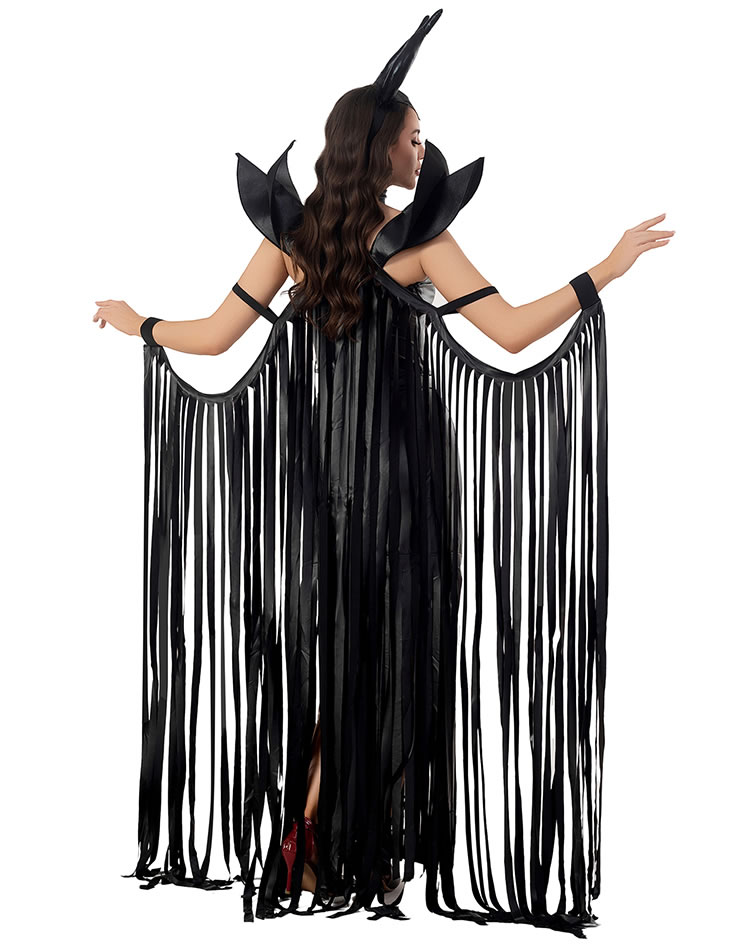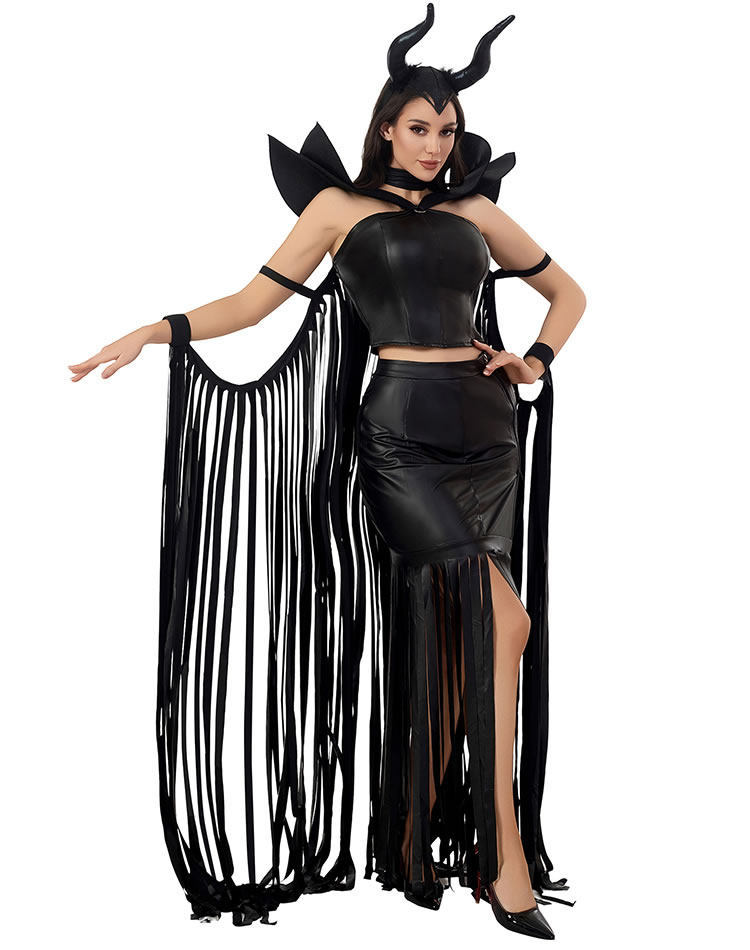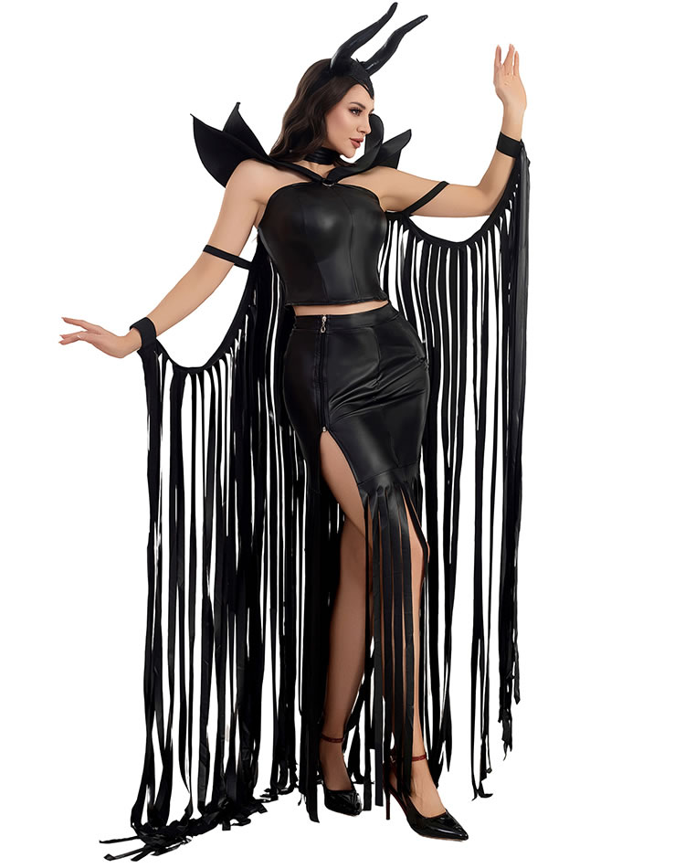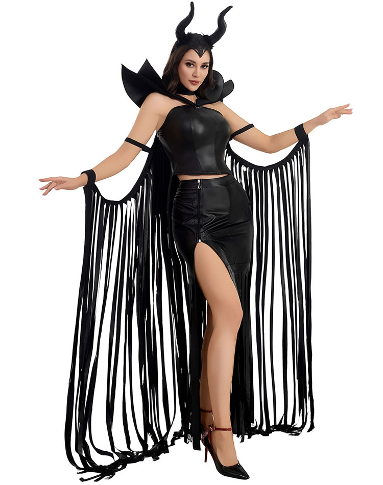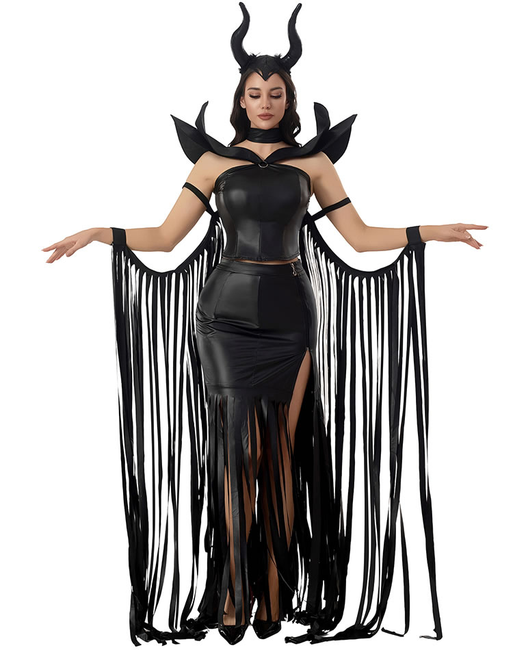 Embrace your inner dark sorceress with this striking costume that combines bold design and dramatic flair. The outfit features a form-fitting black corset top paired with a high-slit pencil skirt, creating a sleek silhouette. A flowing fringe cape drapes from the shoulders, adding movement and mystique, while the iconic horned headpiece and shoulder wings complete the powerful look. Perfect for Halloween, cosplay events, or fantasy-themed parties, this ensemble lets you command attention with every step.