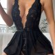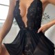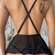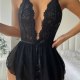 This bold black lace bodysuit features a deep V-neckline with delicate bow-tied straps, creating a striking silhouette. The intricate lace detailing extends across the chest and back, while a sheer mesh skirt adds a playful touch. Designed with crisscross back straps and a small bow at the waist, it combines daring style with feminine charm.