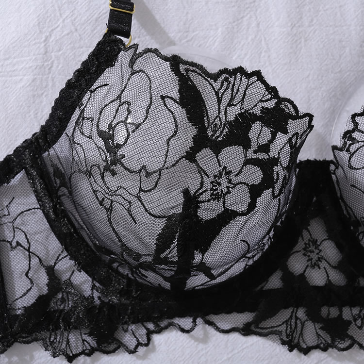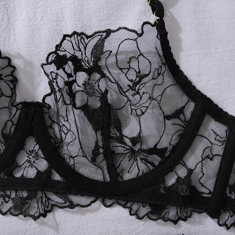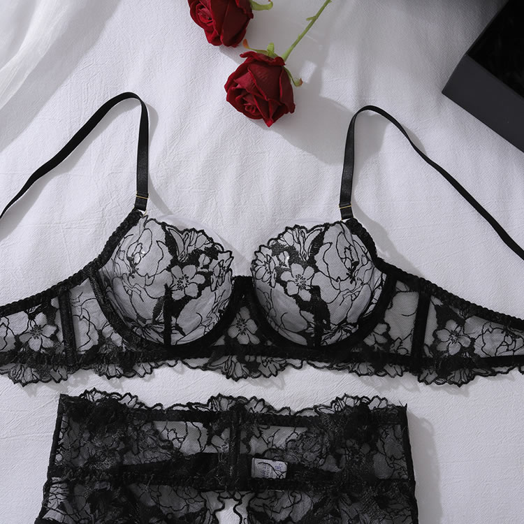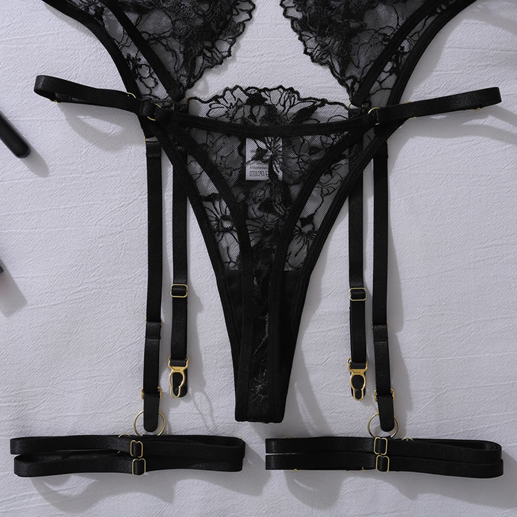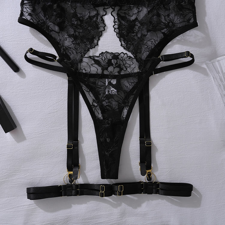 This black lace lingerie set combines classic romance with modern edge. The bra features a full-coverage design with intricate floral lace patterns that frame the silhouette beautifully, supported by slender straps and a central clasp. Paired with a high-waisted garter belt that wraps around the hips and connects to thigh straps, it offers both structure and drama. The matching thong is crafted from sheer lace with cutout details, enhancing its daring appeal. Designed to highlight curves and command attention, this three-piece is perfect for those who love timeless elegance with a bold twist.
