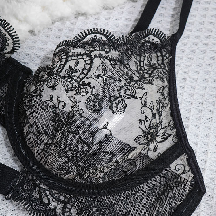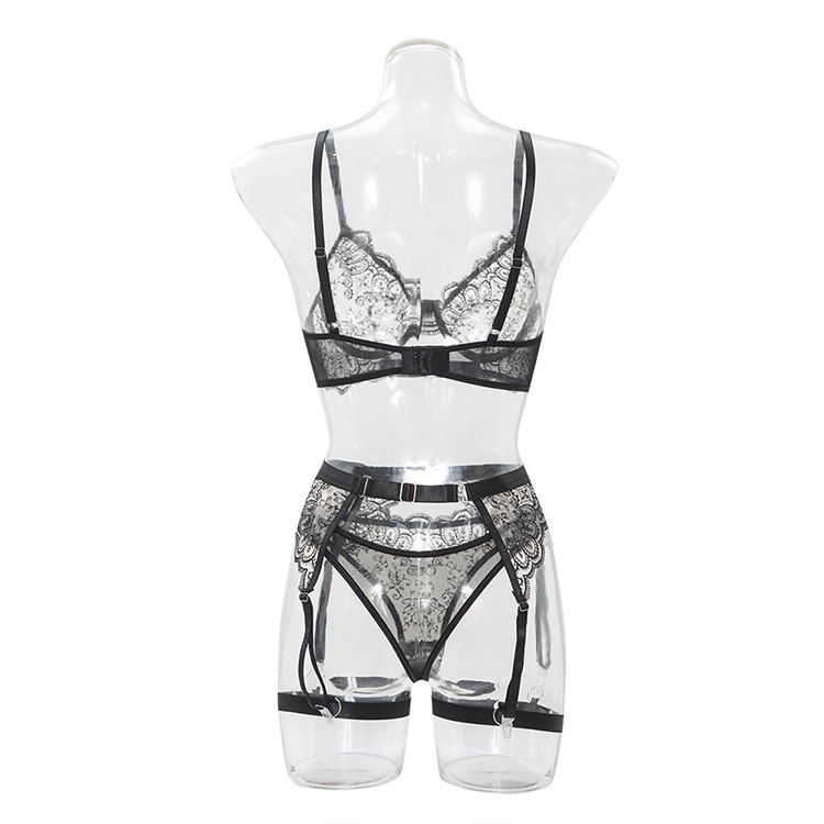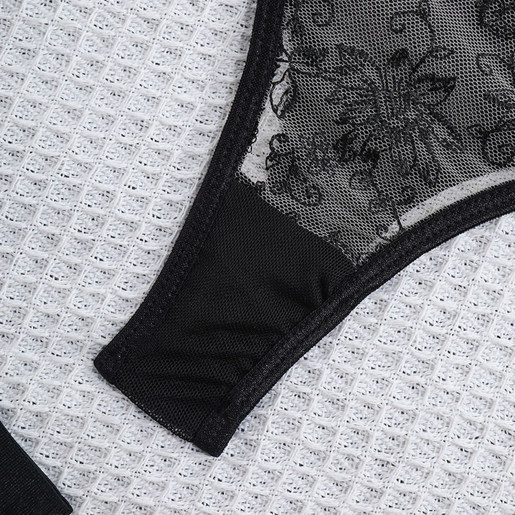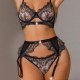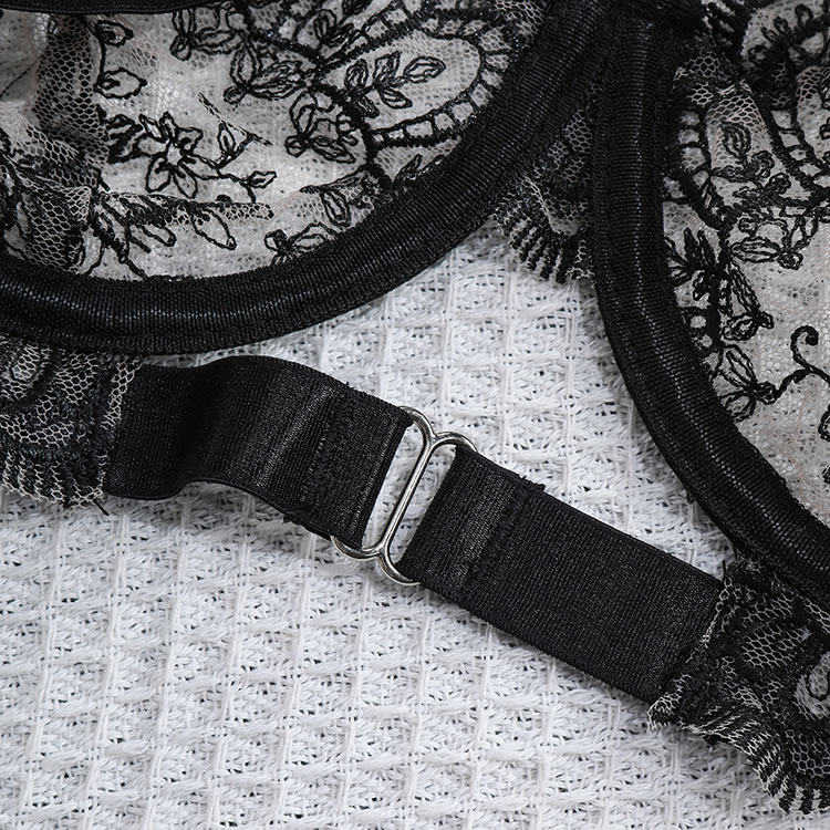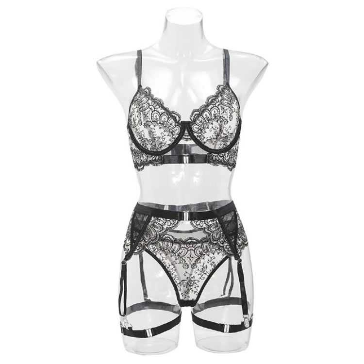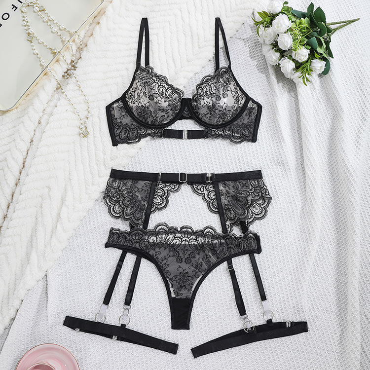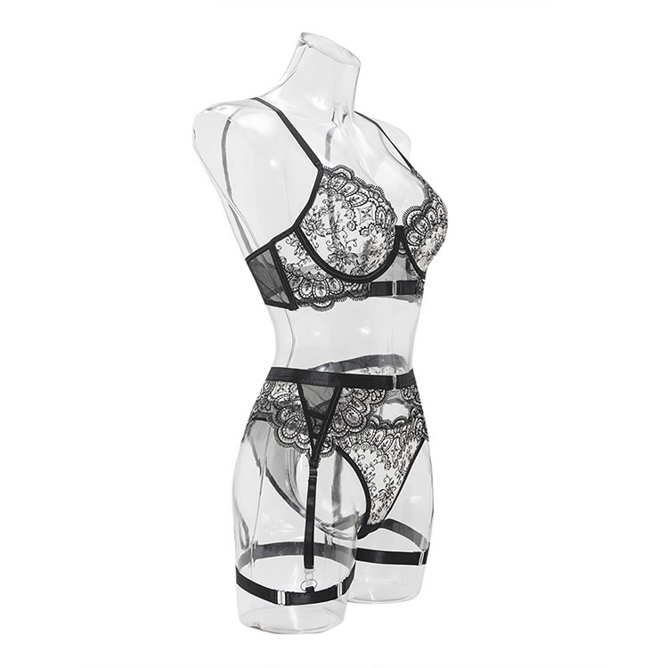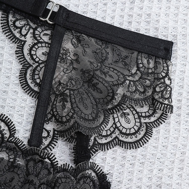 This black lingerie set features a detailed lace bra with scalloped edges and a central band that adds structure to the bust. The matching garter belt includes a wide waistband with decorative lace trim and is connected to adjustable garter straps that wrap around the thighs. Designed for bold expression, the set combines sheer mesh panels with intricate floral patterns for a striking silhouette.