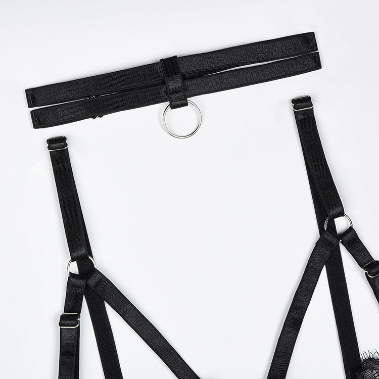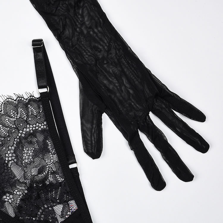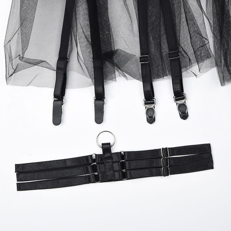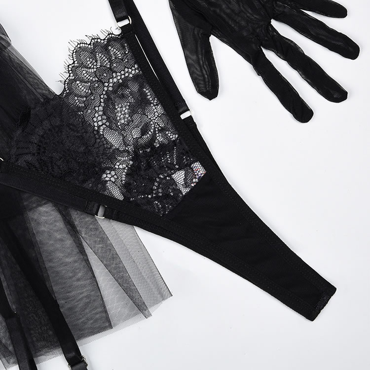 Step into a world of bold expression with this striking black lingerie ensemble that blends gothic charm with modern sensuality. Featuring a lace-adorned bra with crisscross straps and a flirty tulle skirt layered over a high-waisted garter belt, this set makes a dramatic statement. The sheer long gloves and matching choker complete the look, offering both elegance and attitude. Designed for those who love to stand out, it’s perfect for special moments or expressive self-confidence.