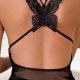 This captivating babydoll set combines delicate lace with sheer fabric for a look that is both elegant and alluring. The V-neckline is framed with intricate floral lace, meeting at a small white bow for a touch of contrast. The main body is made from a soft, transparent mesh that flows loosely over the included matching thong. The standout feature is the stunning open back, designed with a large, detailed butterfly-shaped lace appliqué, creating a memorable and sophisticated silhouette perfect for a special evening.