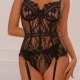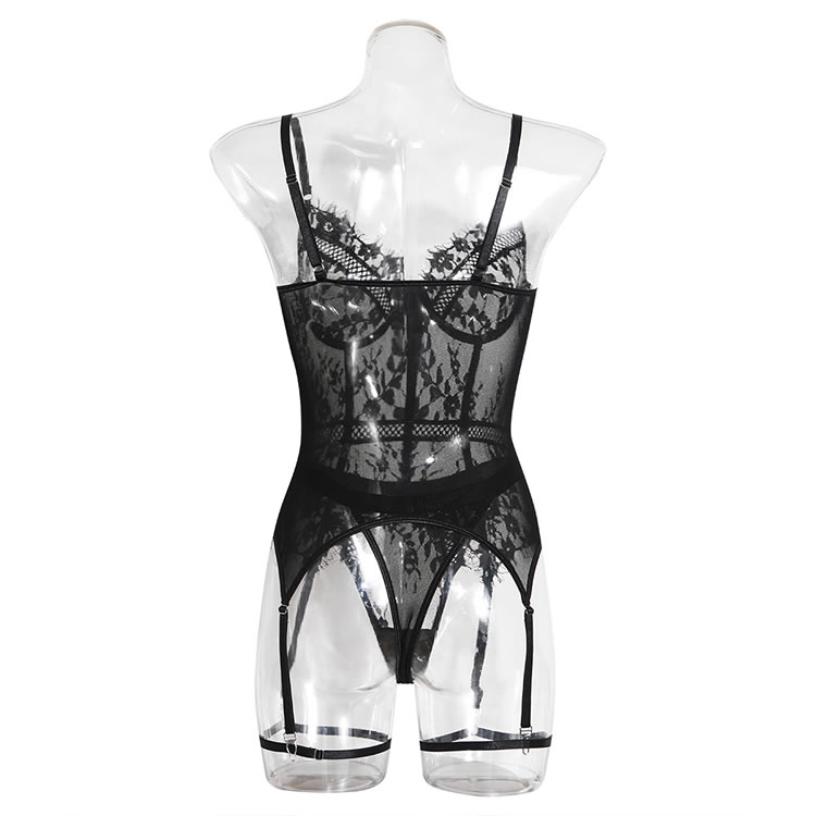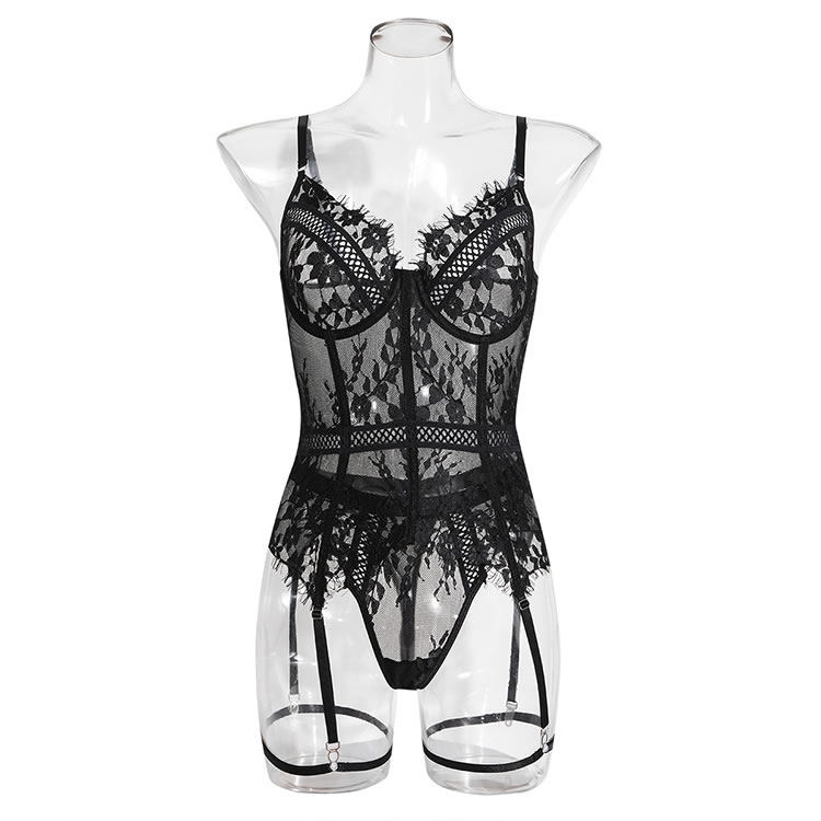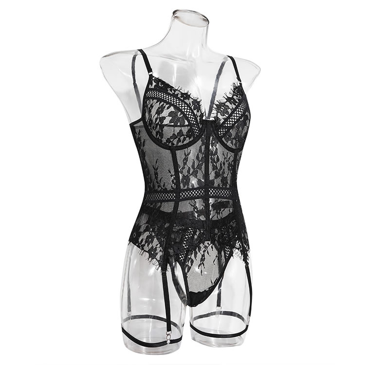 This bold black chemises combines sheer mesh panels with intricate lace detailing for a striking silhouette. The design features structured cups, thin shoulder straps, and a high-cut leg line that enhances curves. Attached garter straps connect to the thighs, adding a vintage-inspired edge. Ideal for making a statement or adding drama to intimate moments.