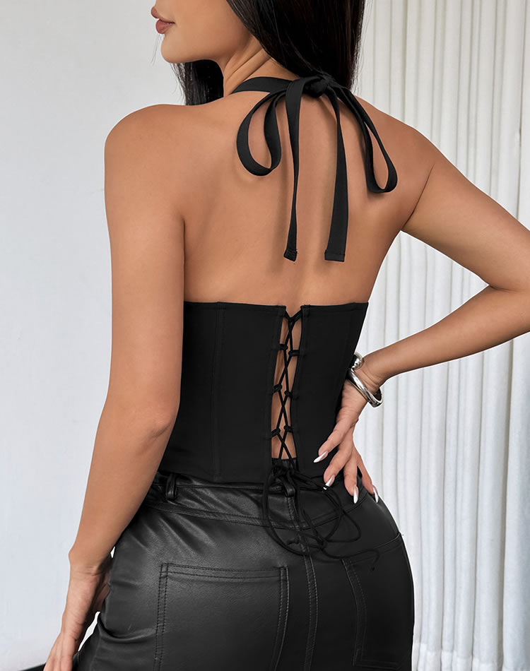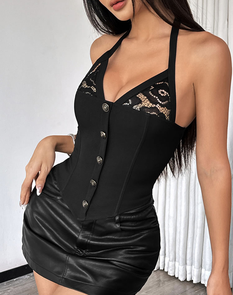 This striking black corset top is a bold statement piece that combines elegance with edge. The lace detailing at the neckline adds a touch of femininity, while the button front design offers a modern twist. Perfect for those who want to make a strong fashion statement, this top pairs effortlessly with high-waisted skirts or pants for a chic and trendy look.