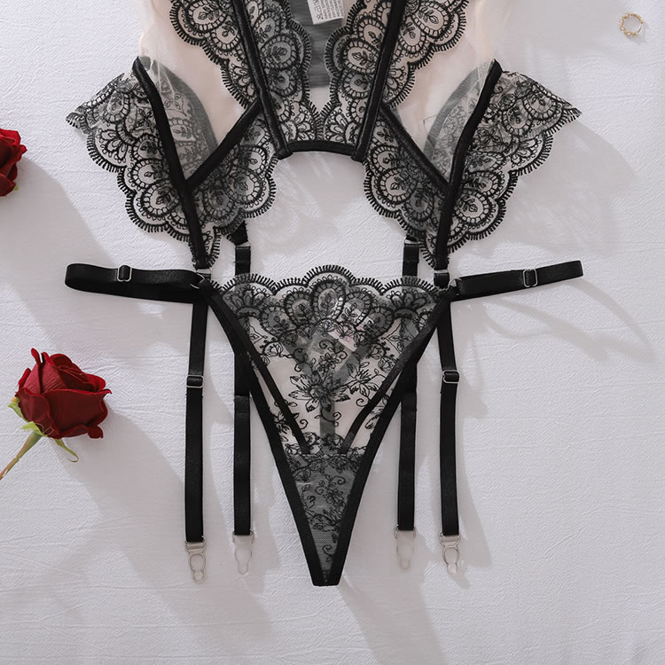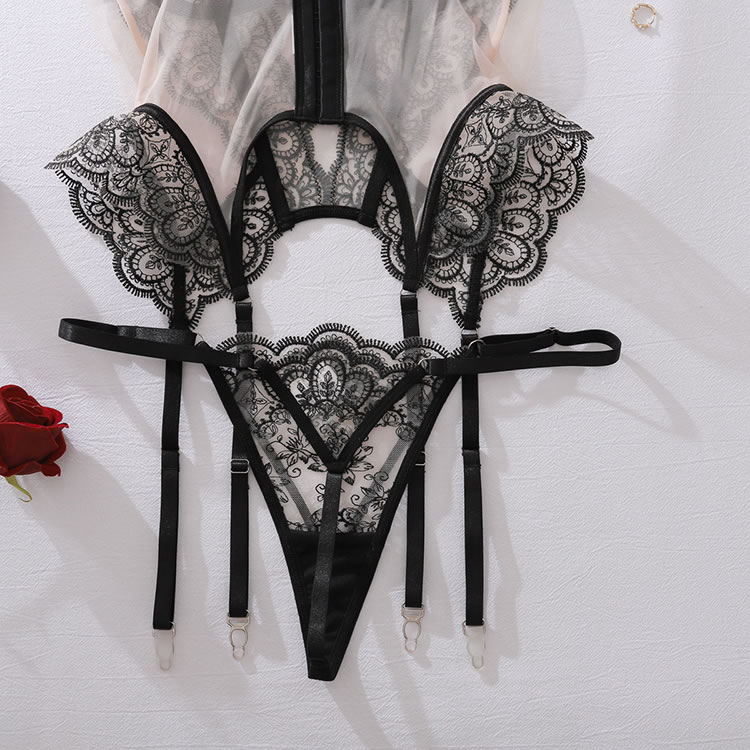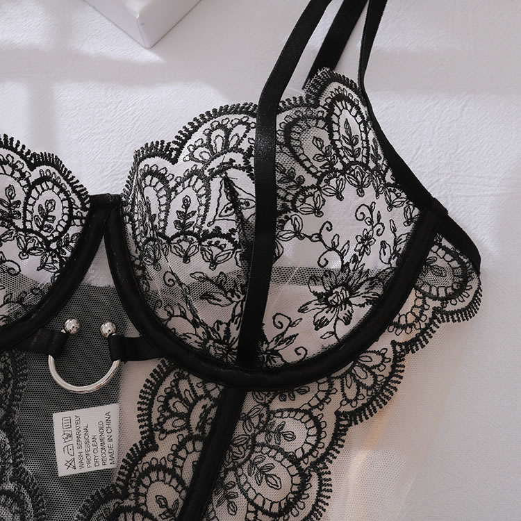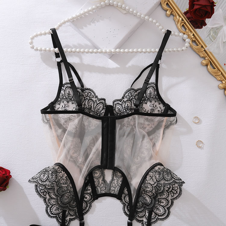 Unleash your inner vixen with this captivating lingerie set, designed to enchant and allure. The set features a longline bustier top crafted from sheer mesh and intricate floral lace, offering a delicate yet daring look. Adjustable straps and a supportive underwire ensure a flattering fit that accentuates your silhouette. The matching bottom is a bold thong style, connected by a multi-strap garter belt that wraps around the waist and thighs, creating a striking web of seduction. This ensemble is perfect for those who want to make a memorable impression.