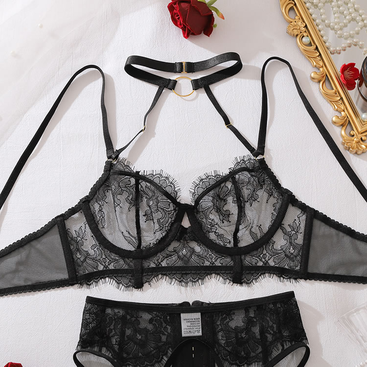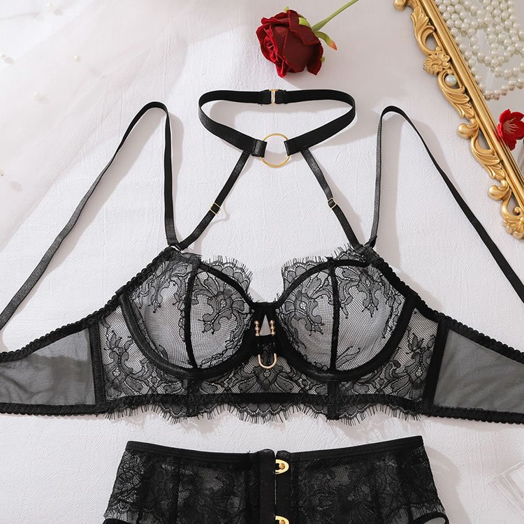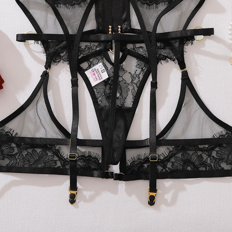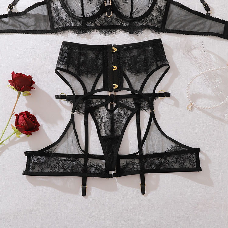 Embrace your daring side with this bold and intricate lingerie set. Crafted from delicate black lace and sheer mesh, it features a structured bra with underwire support and a captivating front clasp. The high-waisted garter belt is designed with multiple adjustable straps and metallic hardware, creating a striking cage-like effect that accentuates your silhouette. This set, complete with a matching choker, is for those who wish to make a powerful and sensual statement.