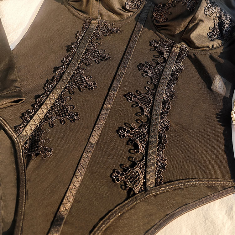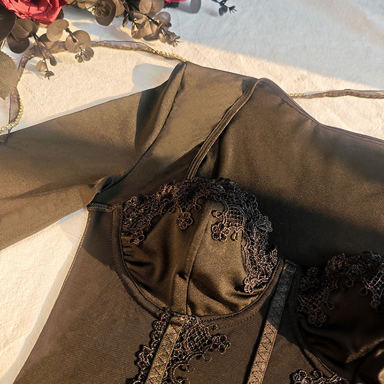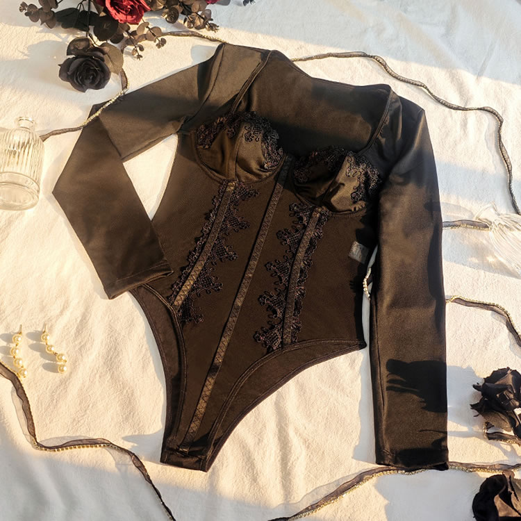 This sleek black bodysuit features a striking contrast between solid fabric and sheer mesh panels, creating a dramatic silhouette that highlights every curve. The structured underwire bra top is adorned with delicate lace trim along the cups and center front, while the full-length sleeves offer a modern, fashion-forward look. Designed with a square neckline and a high-cut leg line, it blends edgy style with feminine detail—perfect for making a confident statement whether worn solo or layered under outerwear.