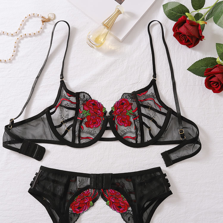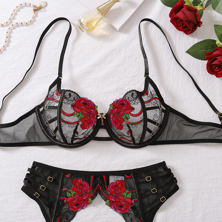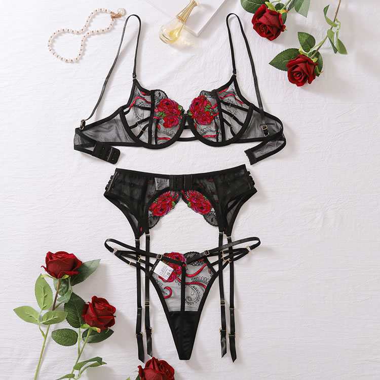 This daring black lingerie set makes a bold statement with its sheer mesh fabric and vibrant floral embroidery. The bra features structured cups with intricate red and pink rose detailing, framed by sleek black trim and gold-tone hardware. Adjustable straps lead to a clean back closure, while the matching high-waisted thong includes a garter belt system with suspenders that attach to thigh bands. Designed for confidence and drama, this set blends romance with edge through its striking patterns and open design.