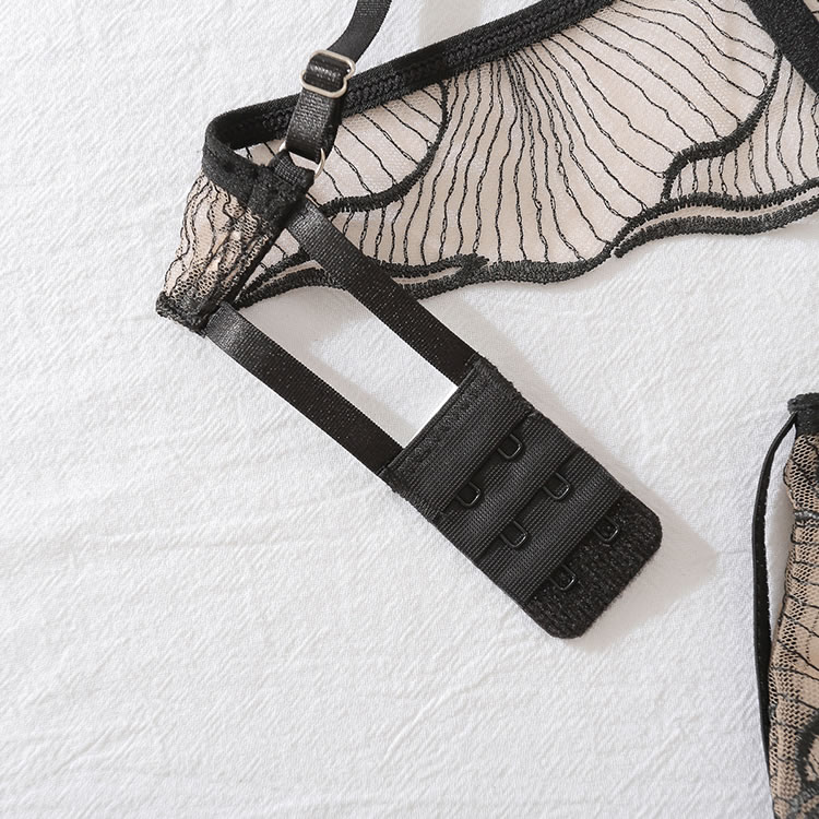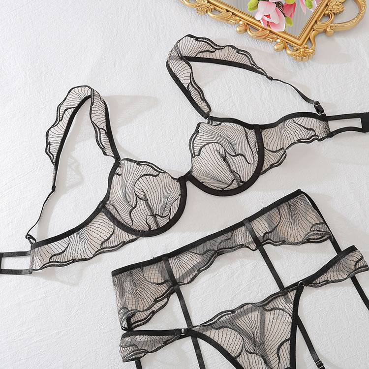 This bold and daring lingerie set features a sheer mesh design with intricate leaf-patterned detailing that adds a touch of nature-inspired elegance. The structured bra offers support with delicate ruffled straps, while the matching high-waisted garter belt with adjustable suspenders enhances your silhouette. Designed for confidence and sensuality, this set combines edgy lines with soft textures for a look that’s both empowering and captivating.