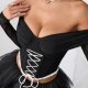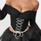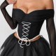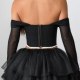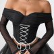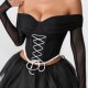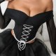 Channel a darkly romantic aesthetic with this striking off-the-shoulder corset top. Designed to make an impression, it features a structured black bodice with dramatic white criss-cross lacing at the front, creating a bold visual contrast. The sweetheart neckline flows into sheer, long mesh sleeves that add a touch of mystery and elegance. A delicate white lace trim lines the bottom hem, perfectly complementing the lacing. This piece is ideal for themed parties, gothic events, or anyone looking to embrace a unique and edgy style.