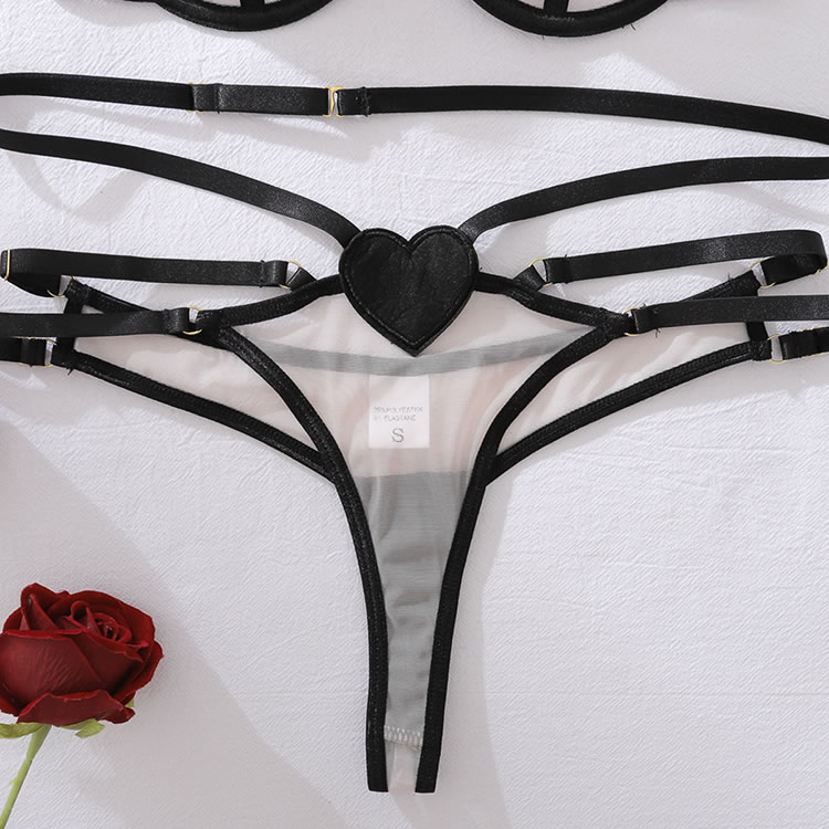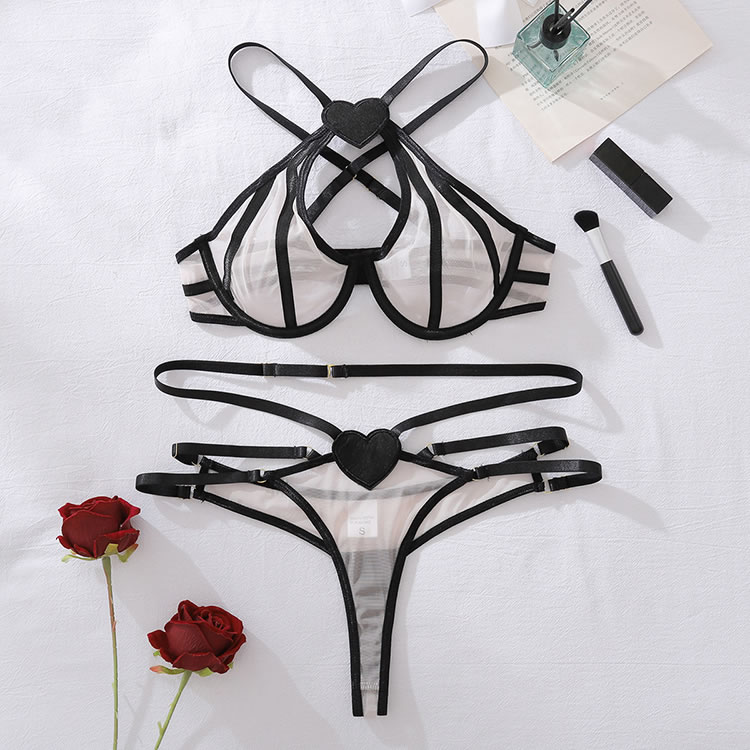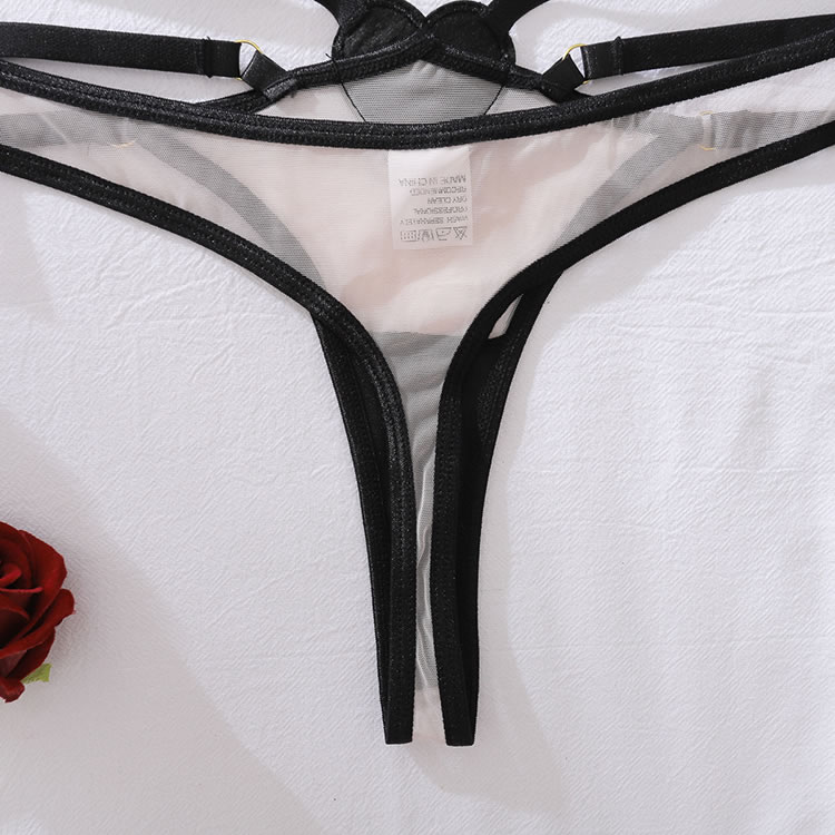This striking lingerie set features a unique design with crisscross straps on the back, adding an element of intrigue and allure. The combination of sheer fabric and solid black accents creates a captivating contrast that enhances your natural curves. Perfect for those who want to make a bold fashion statement in the bedroom.