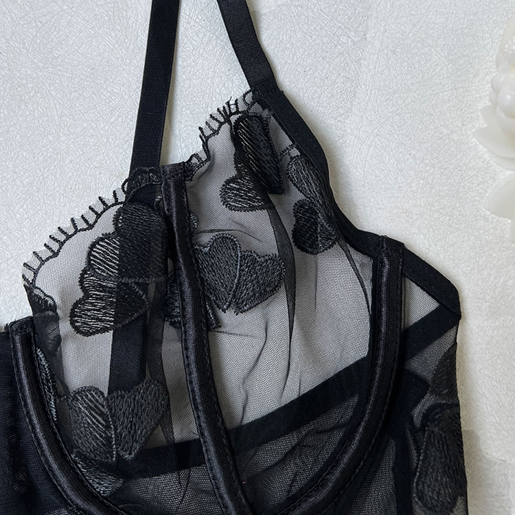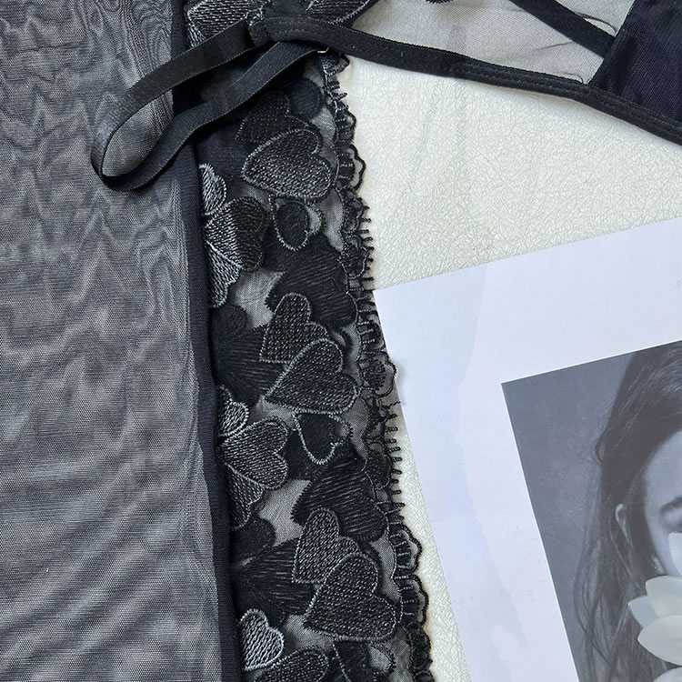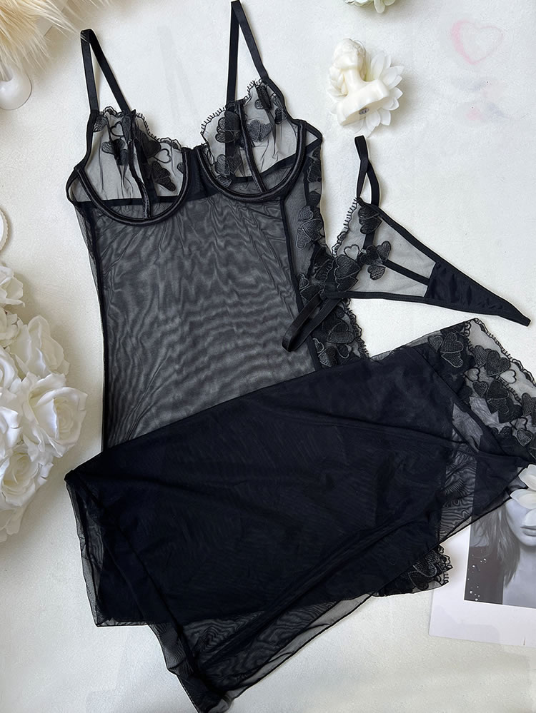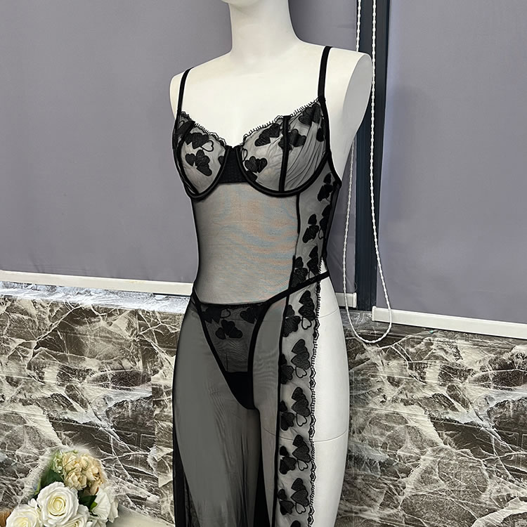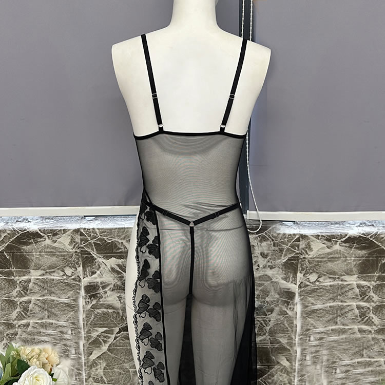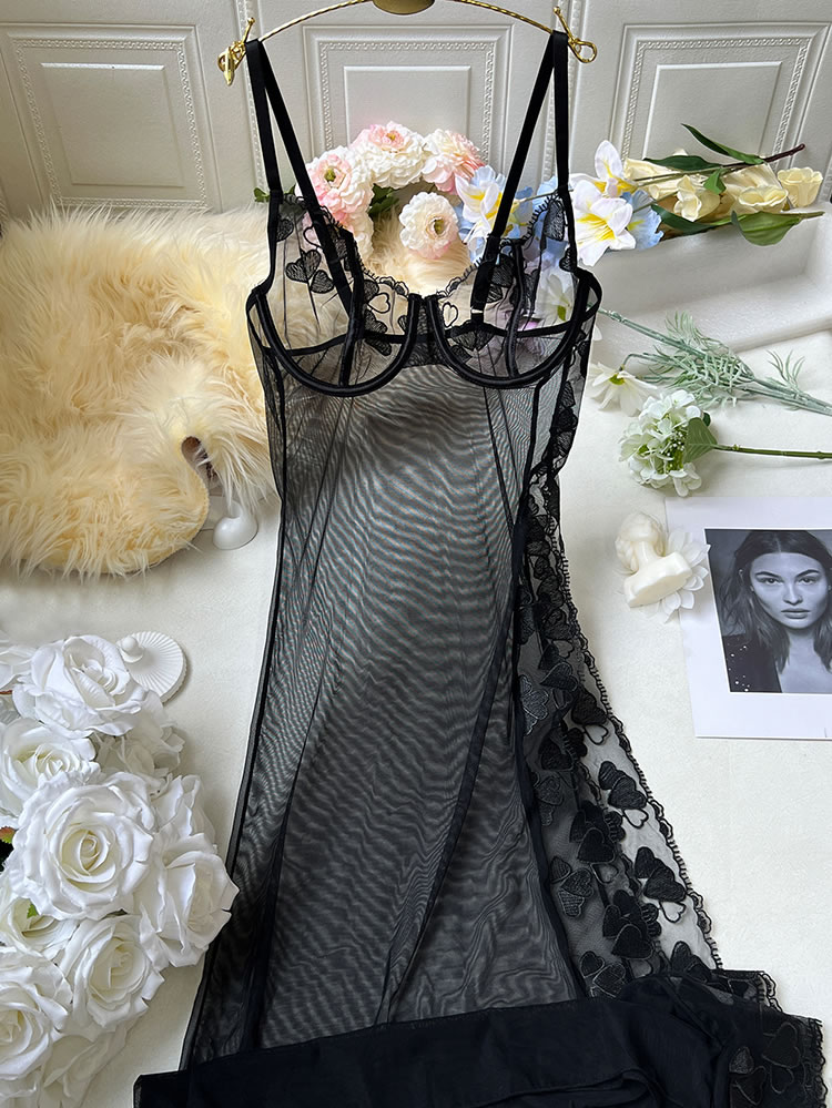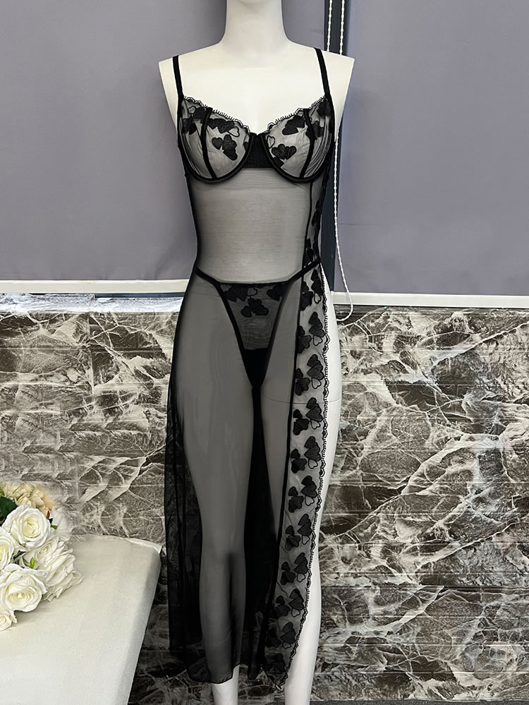 This elegant black sheer robe features a built-in bra with floral lace detailing, offering both support and style. The long, flowing silhouette is enhanced by a high slit that adds movement and drama. Designed with thin spaghetti straps and a soft drape, it’s perfect for creating a bold impression while maintaining a graceful look.