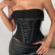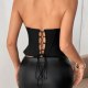 Command attention with this bold strapless corset top. Designed for a dramatic silhouette, it features a wide, fold-over neckline that transitions into a striking front lace-up detail with silver-toned eyelets. The adjustable lacing allows you to customize the fit and accentuate your waistline. Paired with a sleek mini skirt, this piece delivers an edgy, gothic-inspired look perfect for parties or making a statement at any event.