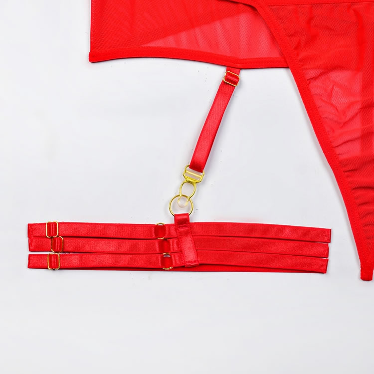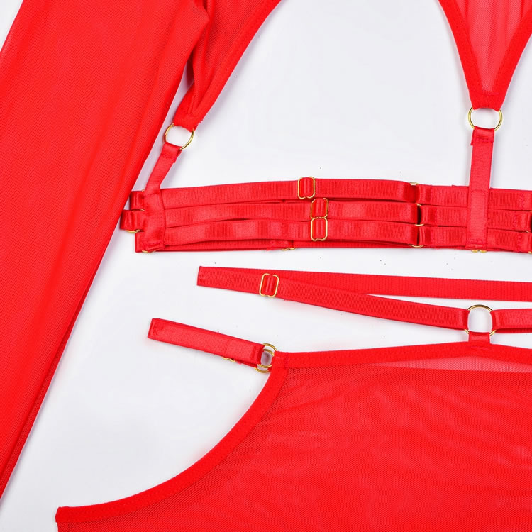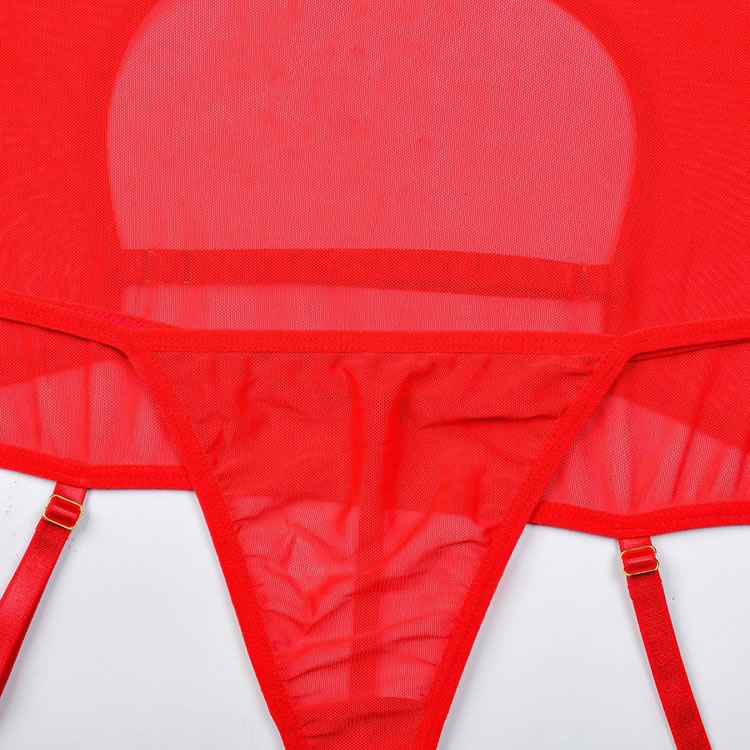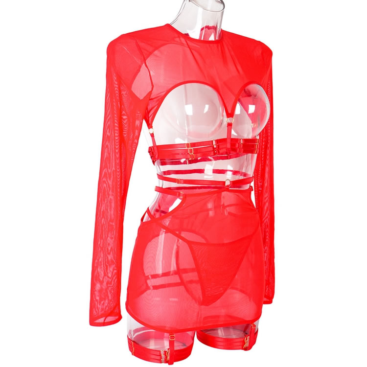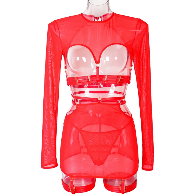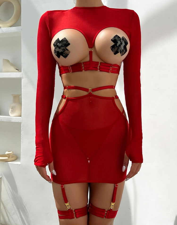 Turn it up a notch in this ultra sexy bra and skirt set featuring open cups, a high neckline with a hook back closure, sheer long sleeves, and a matching sheer skirt with adjustable garter straps, wraparound leg garters, and a matching panty.