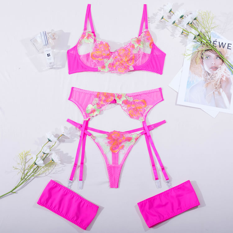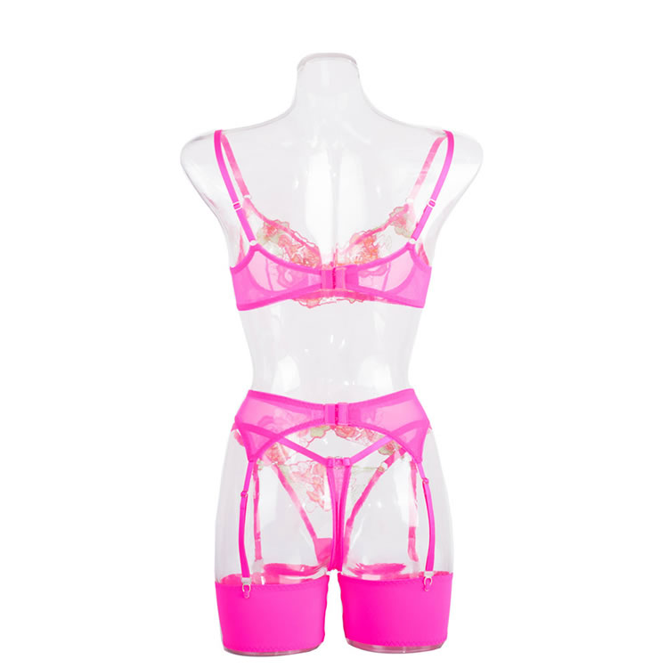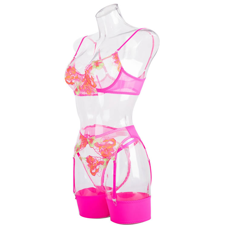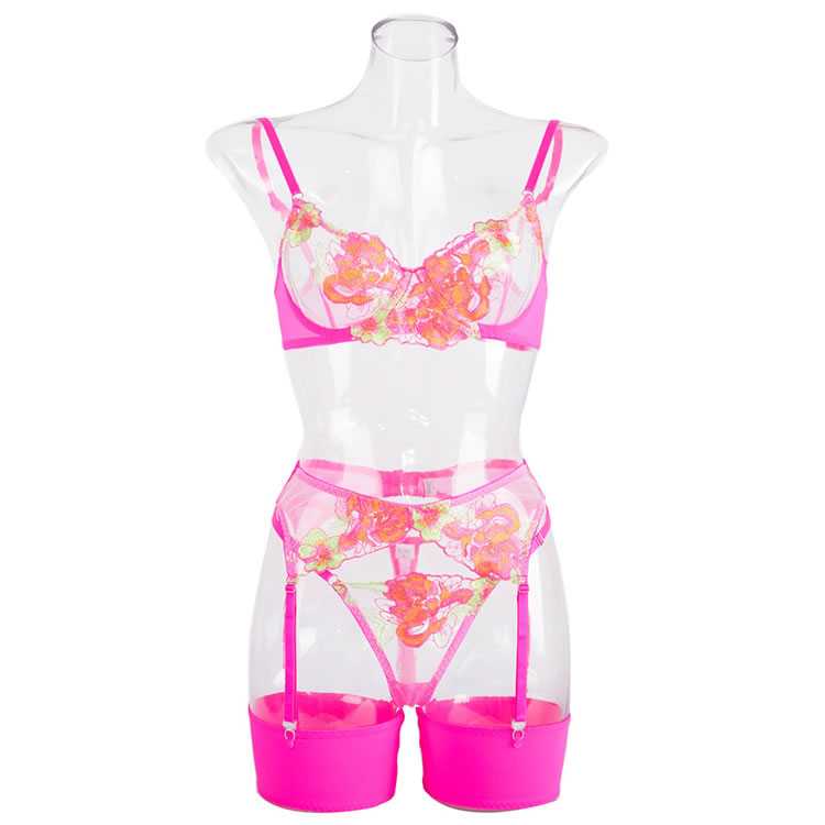 Blossom into a sex kitten in this sensual mesh bra set featuring sheer underwire cups with colorful floral embroidery, adjustable spaghetti straps, a hook and eye back closure, a garter belt with a back hook closure and adjustable garter straps, wraparound leg garters, and a matching thong panty.