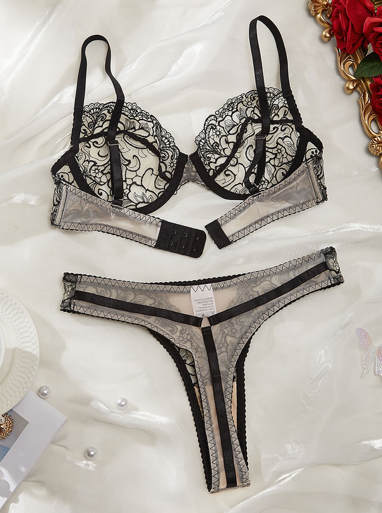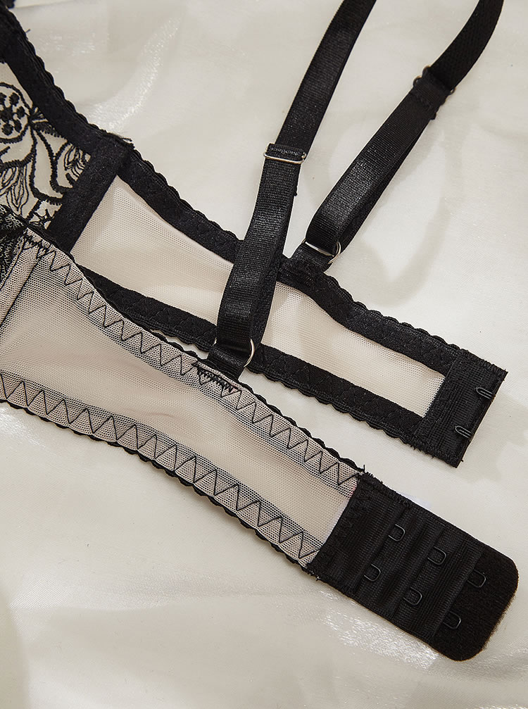 Blossom into a sex kitten in this sensual mesh bra set featuring sheer underwire cups with floral embroidery, adjustable spaghetti straps, a hook and eye back closure, and a matching panty.