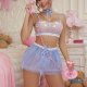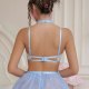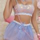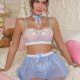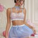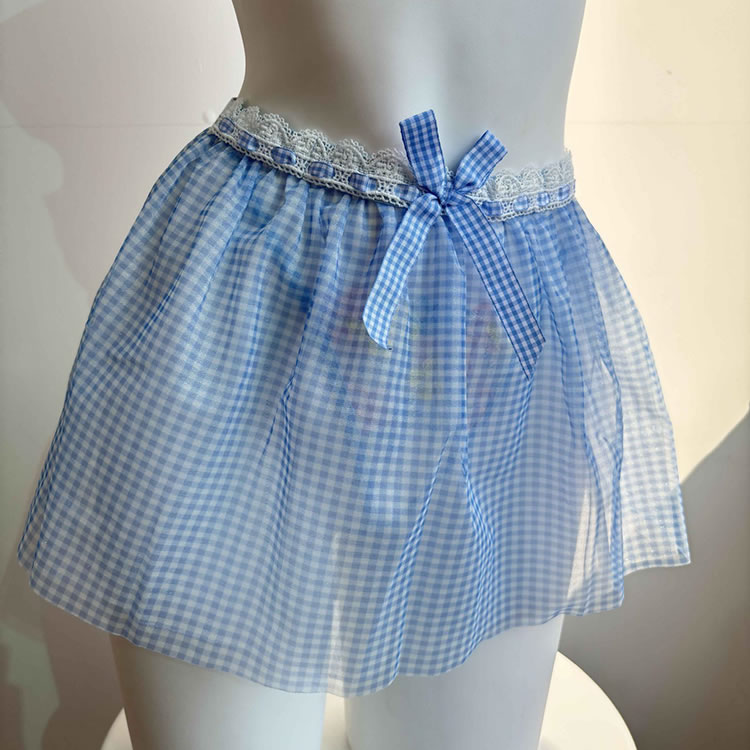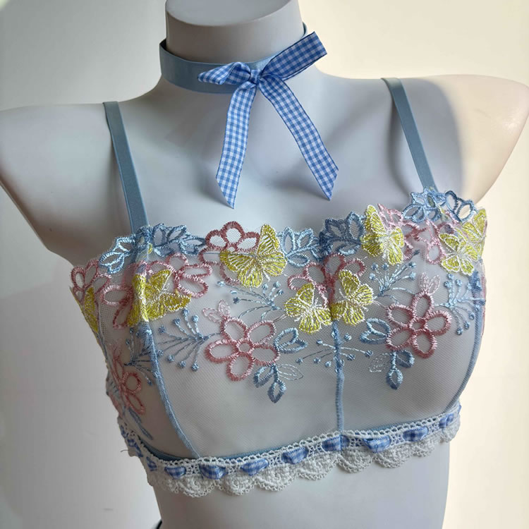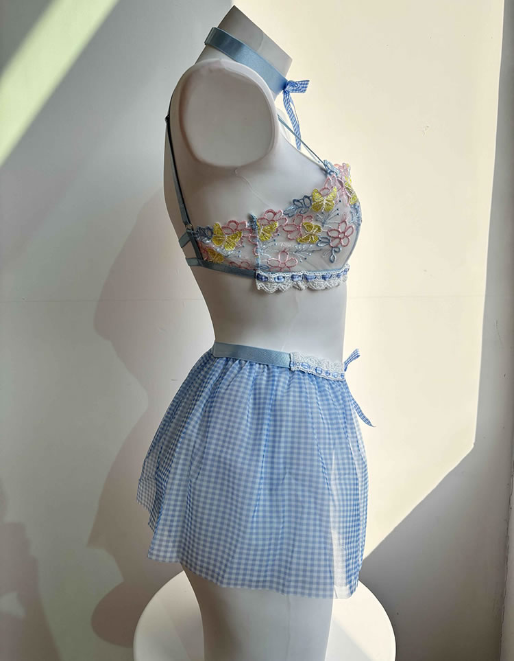Step into a world of vintage sweetness with this charming lingerie set that blends youthful energy and retro flair. The sheer bralette features colorful floral embroidery on a delicate mesh base, framed by soft blue trim and lace edging. Paired with a flirty gingham mini skirt in light blue and white check, it adds a classic touch of schoolgirl style. The matching choker with a bow completes the look, making it perfect for themed nights, romantic evenings, or when you want to feel like a playful dreamer.