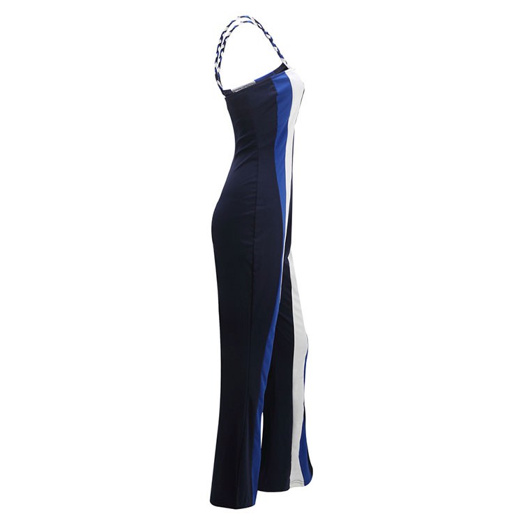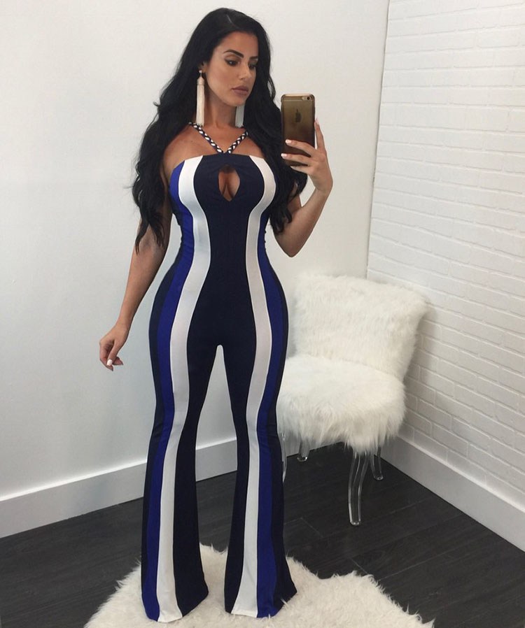 This sexy sleeveless halter neck blue and white wiggle silhouette all-in-one jumpsuit