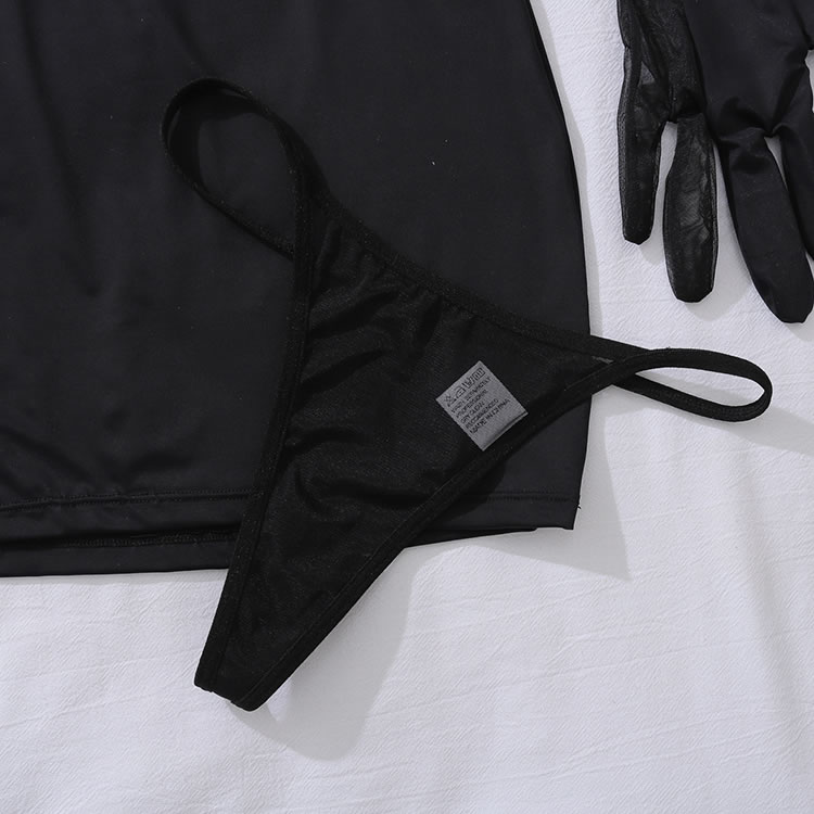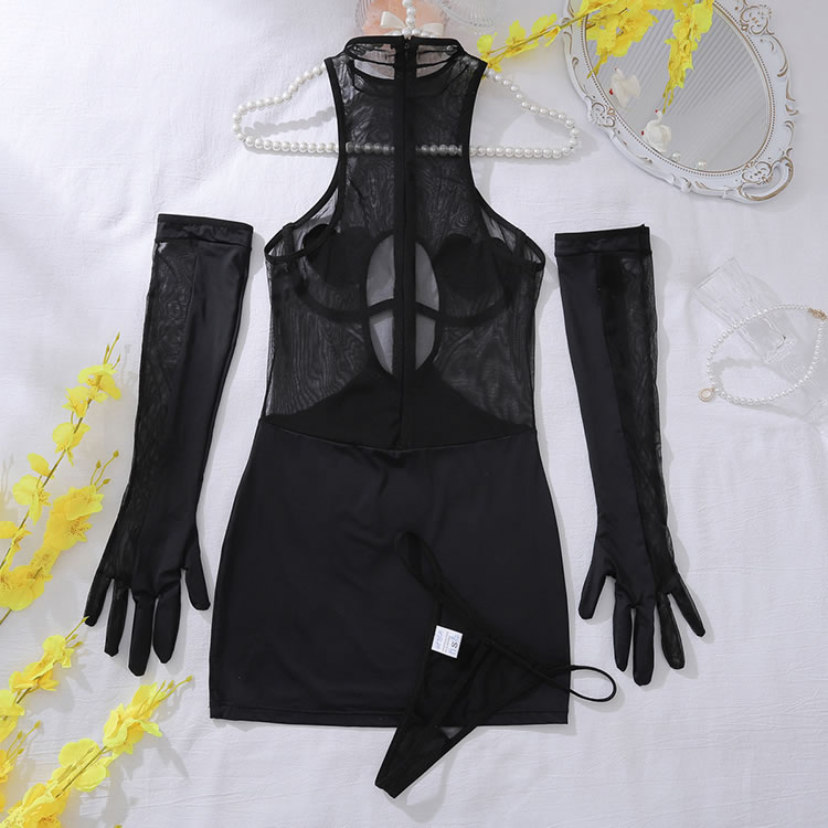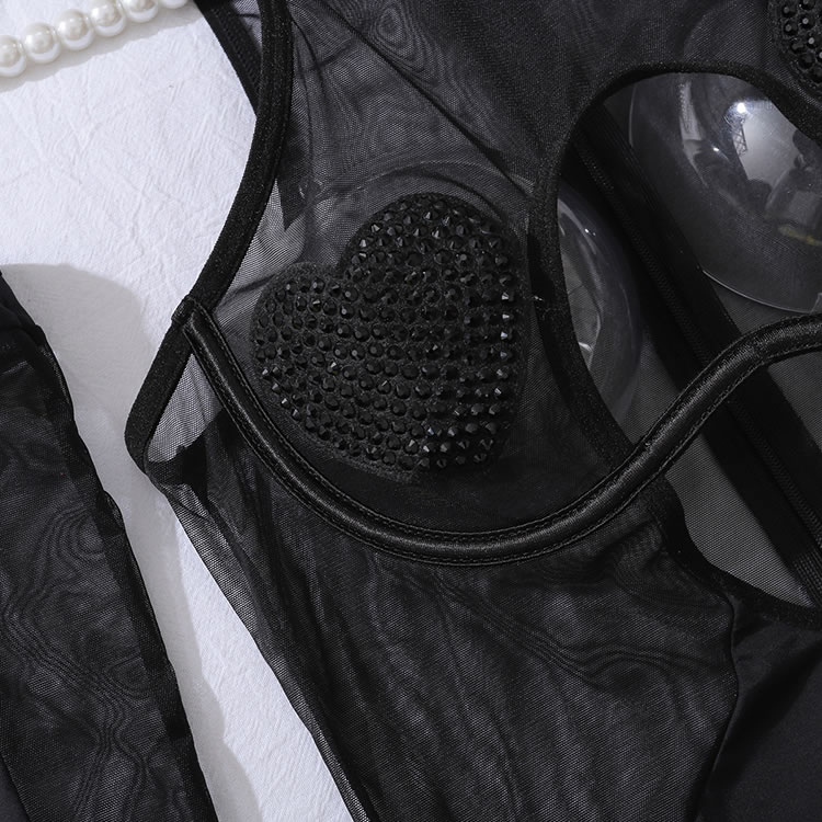 Embrace your daring side with this black mini dress. The combination of sheer mesh and solid fabric creates a captivating contrast, enhanced by the heart-shaped cutouts with glittering details. The high neckline and long sleeves offer a touch of elegance, making it ideal for special occasions or nights out where you want to feel confident and alluring.