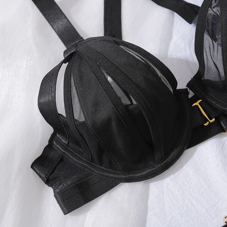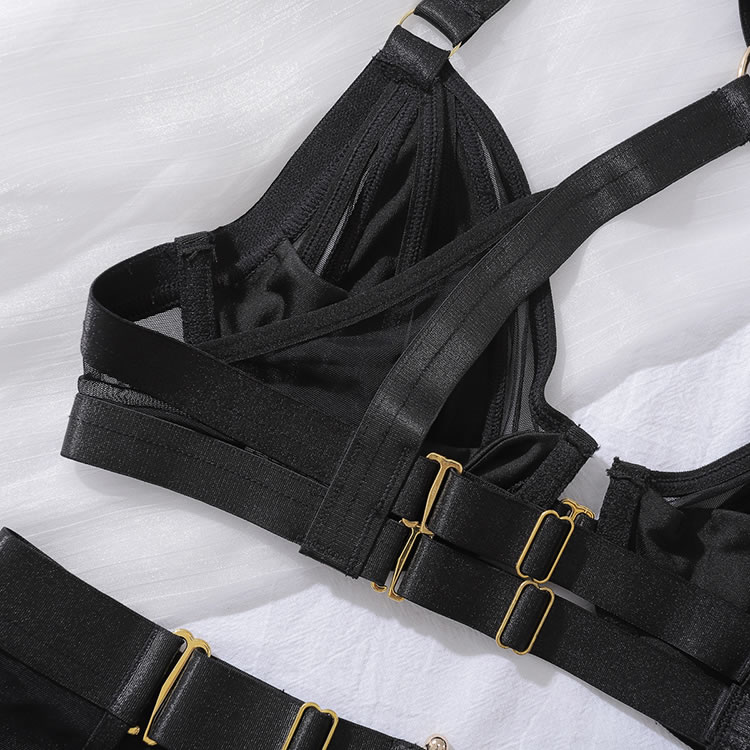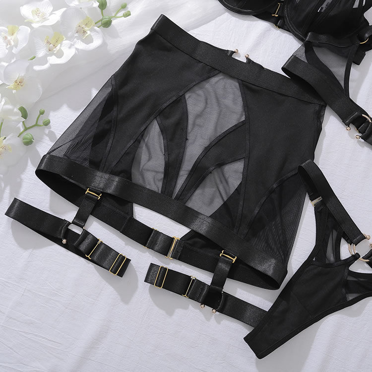 This striking black harness set is designed for those who love to make a statement. The intricate straps and gold accents create a bold, edgy look that exudes confidence. The sheer fabric adds a touch of allure, while the adjustable straps ensure a comfortable fit. Perfect for adding a unique twist to your lingerie collection.