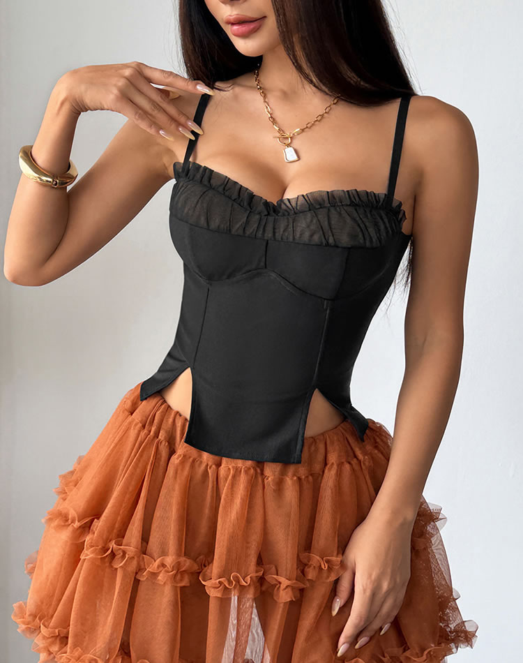 This striking black corset top features a sleek design with ruffled detailing that adds a touch of femininity. The adjustable straps ensure a comfortable fit, while the structured silhouette enhances your natural curves. Perfect for those who love to make a bold statement in their fashion choices.