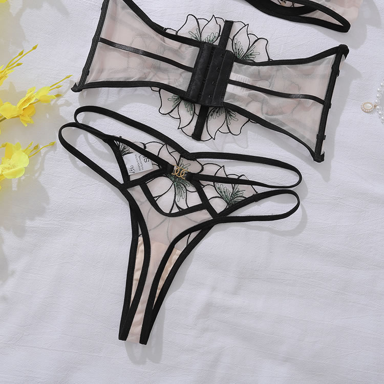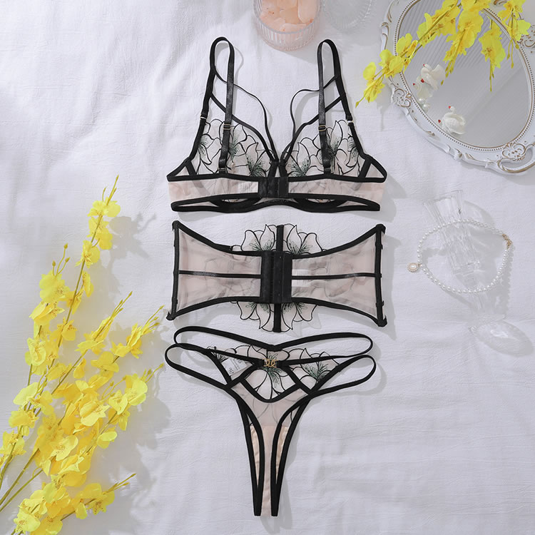 This lingerie set is a perfect blend of boldness and allure. The sheer fabric with intricate floral embroidery adds a touch of elegance, while the black straps and cut-out details create a striking silhouette. The adjustable back ties ensure a comfortable fit, making it an ideal choice for those who want to feel confident and stylish.