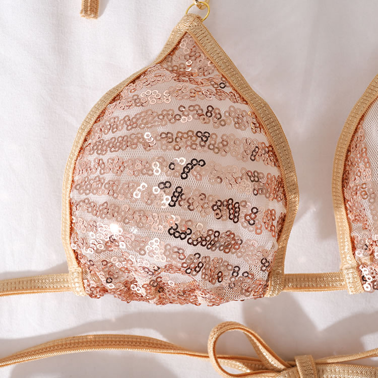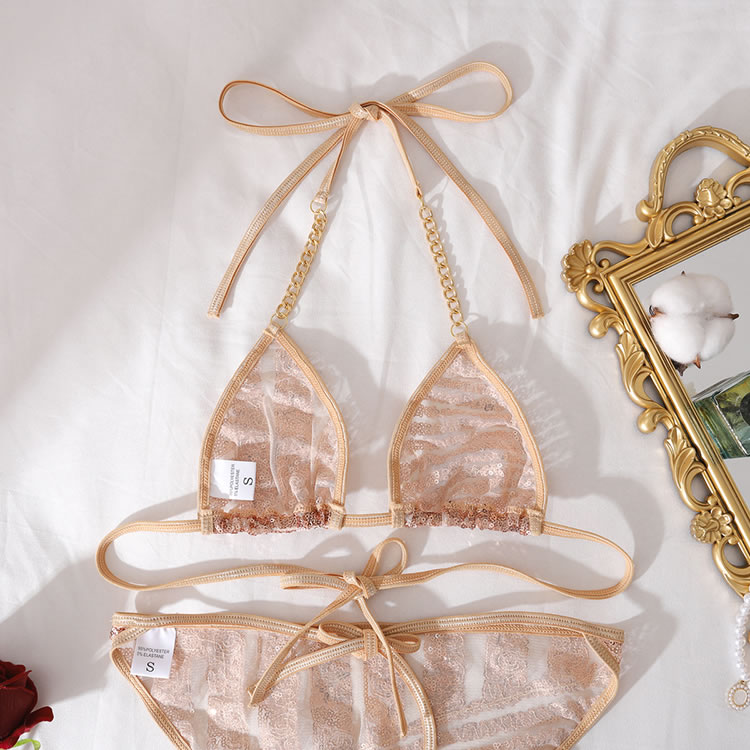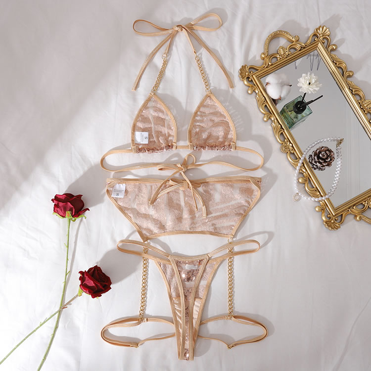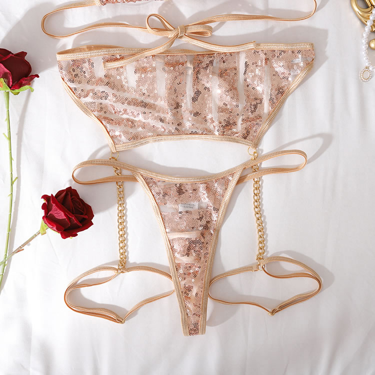 This gold lingerie set is designed to make a statement with its shimmering sequins and intricate detailing. The bra features a deep V-neckline that accentuates your décolletage, while the matching thong and garters add an element of allure. The adjustable straps and ties ensure a comfortable fit, making it perfect for those who want to feel confident and alluring.