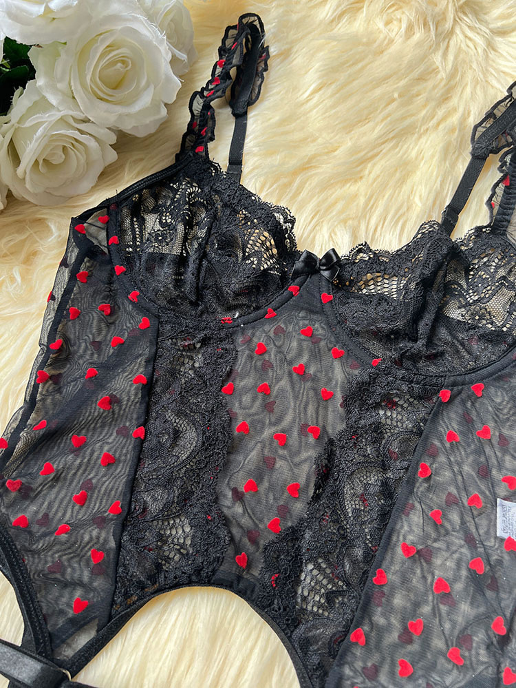This striking chemises set combines bold lace with vibrant red heart accents for a look that is both edgy and alluring. The intricate lace detailing adds a touch of elegance, while the garter straps ensure your stockings stay in place. Perfect for those who want to make a statement and feel confident in their lingerie.