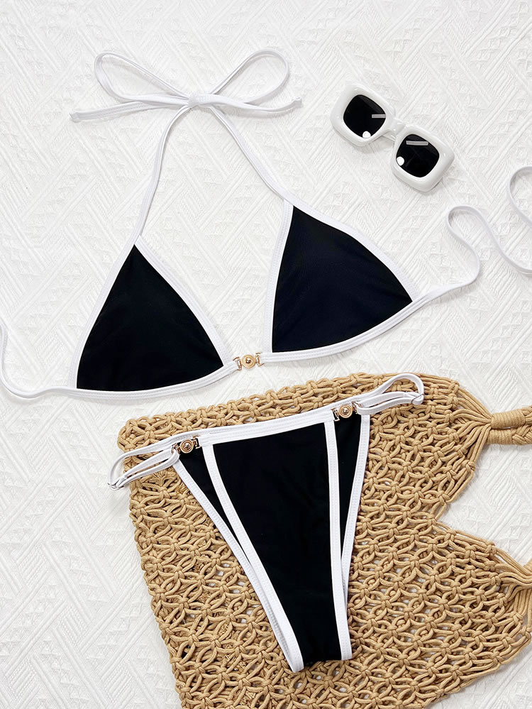 Stand out in this bold black and white bikini set. The top features a classic triangle design with white trim, providing both support and style. The matching bottoms offer a sleek fit, making it perfect for those who want to feel confident and trendy by the pool or beach.
