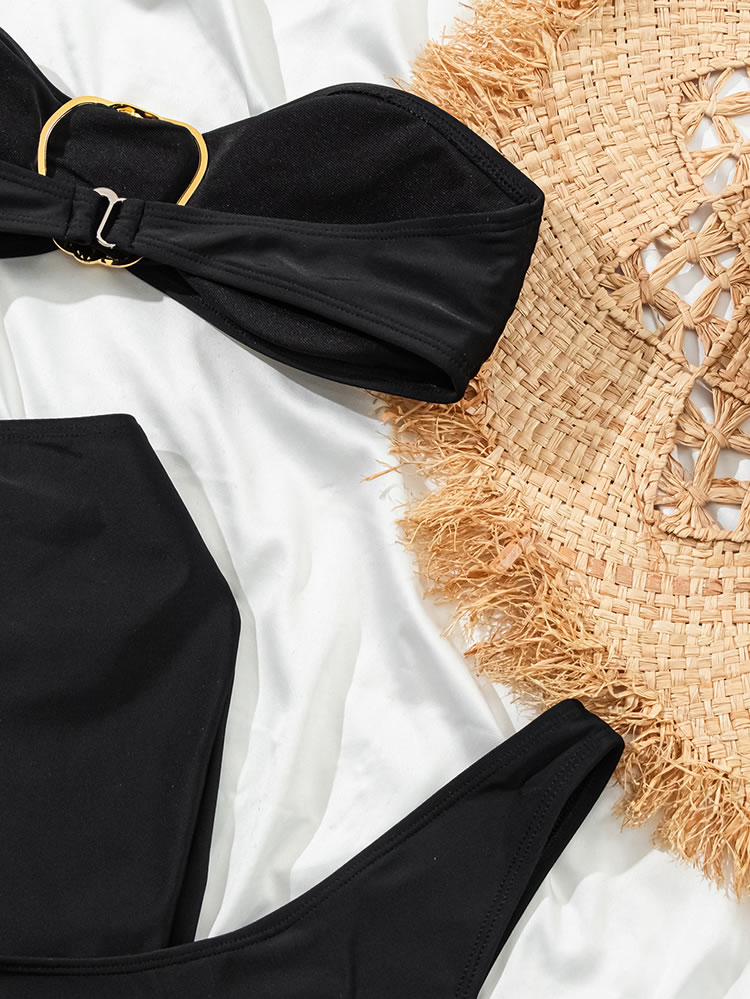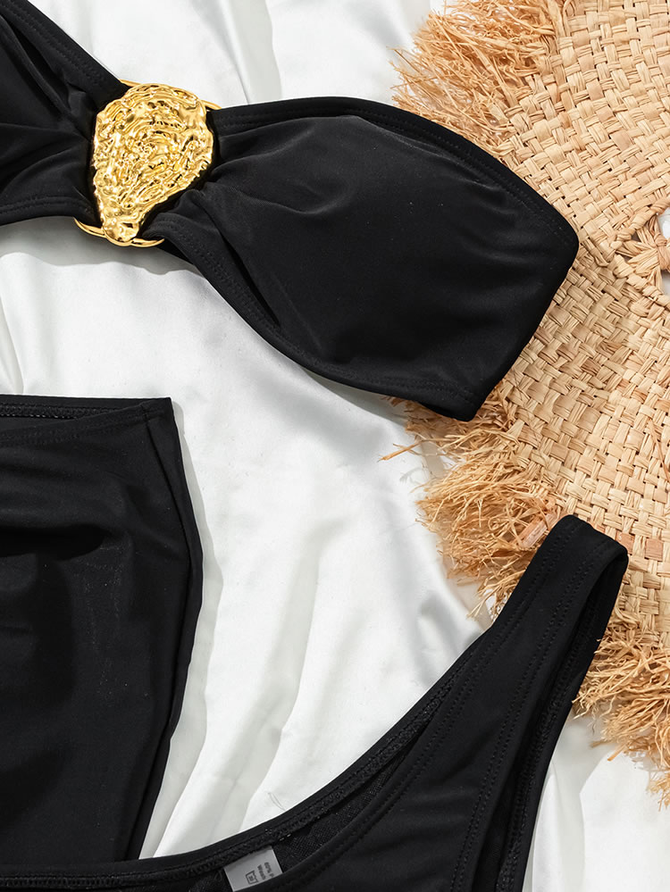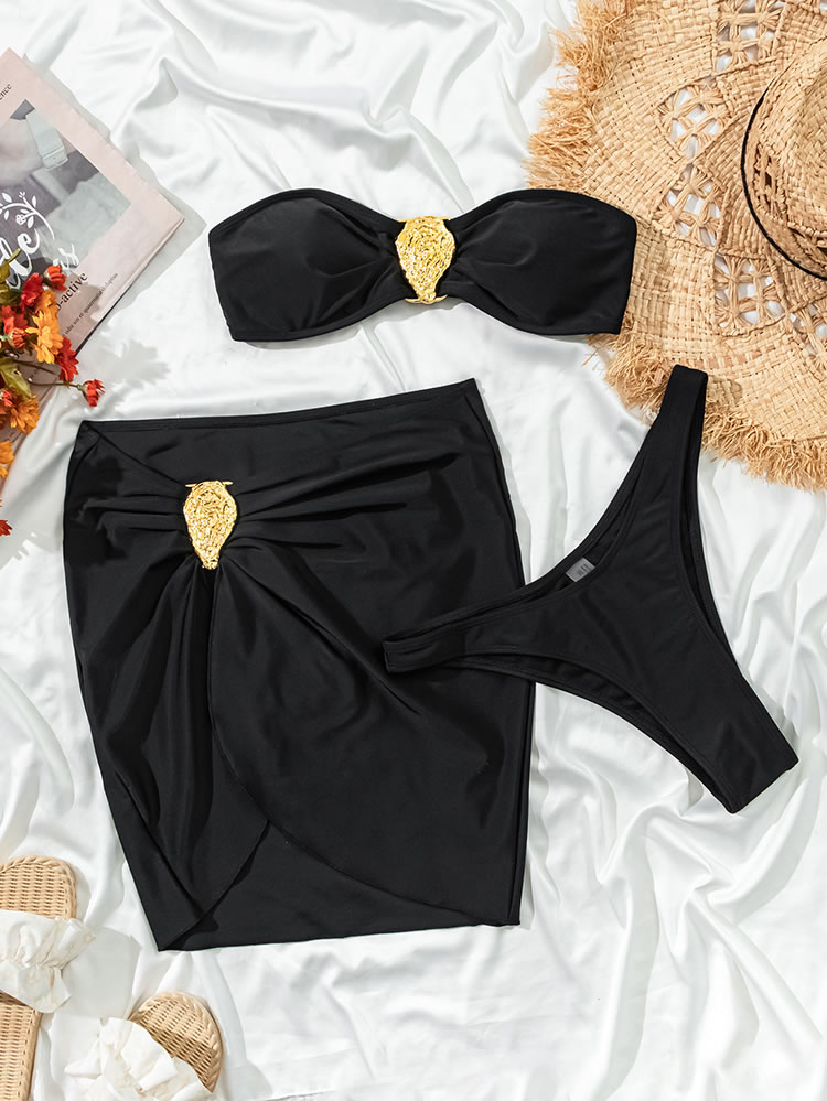 Make a statement in this bold black bandeau bikini, featuring eye-catching gold shell embellishments on both the top and wrap skirt. The sleek design offers a perfect blend of style and comfort, making it an ideal choice for those who want to feel confident and trendy by the pool or beach.
