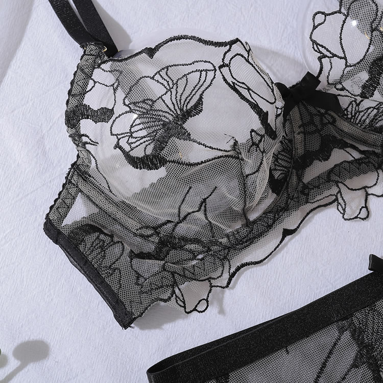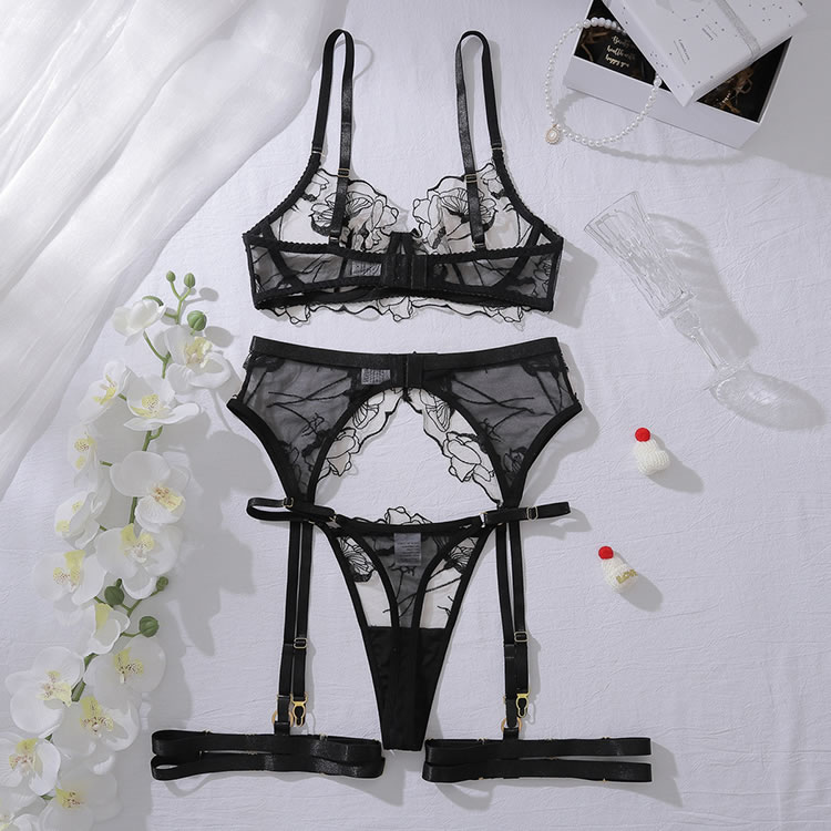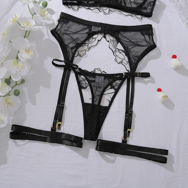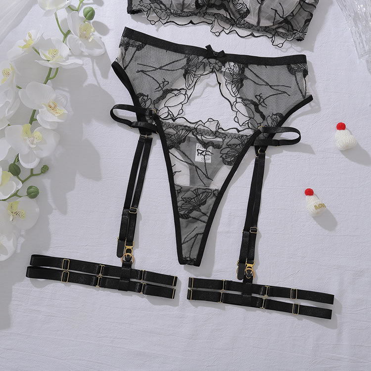 Make a statement with this bold black floral lace bra and garter set. The sheer fabric is adorned with intricate floral embroidery, creating a captivating and alluring look. The adjustable straps and garters ensure a comfortable fit, perfect for those who want to feel both confident and stylish.