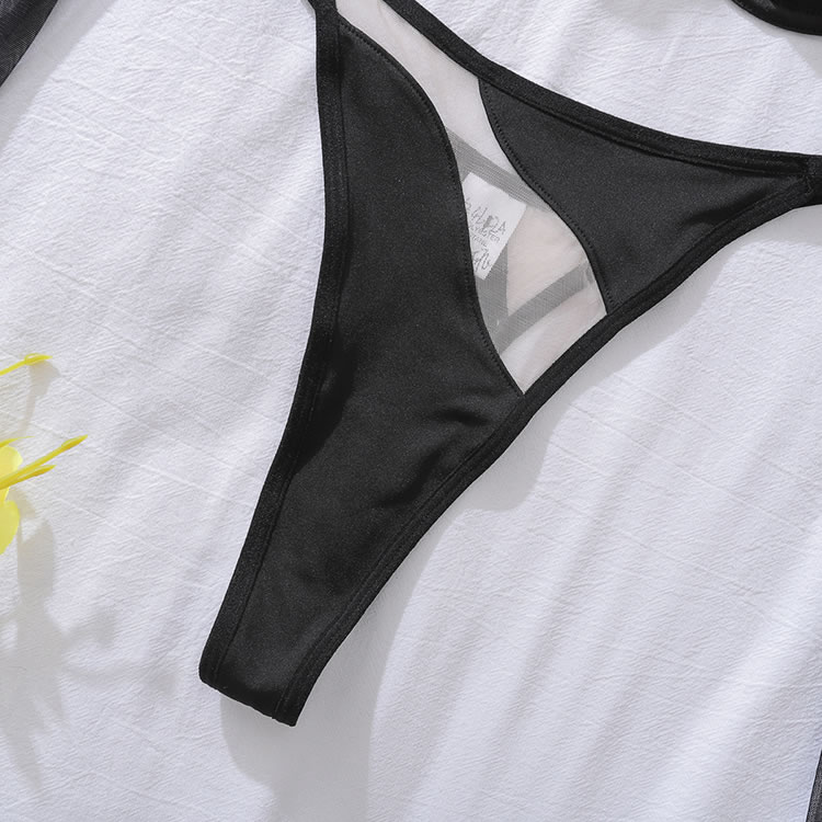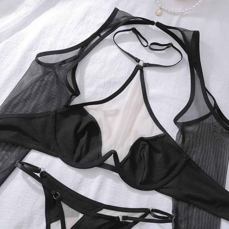 Make a statement with this bold black sheer bra and thong set. The intricate design that add an element of allure, while the sheer sleeves enhance the overall look. Perfect for those who want to feel both confident and stylish in their lingerie.