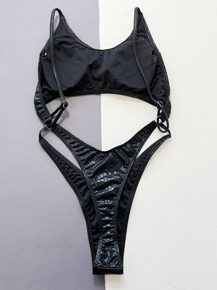 Make a statement in this bold black snakeskin-style one-piece swimsuit. The textured design adds an edgy touch, while the cutout detail at the waist enhances your silhouette. Perfect for those who want to feel confident and stylish by the pool or beach.
