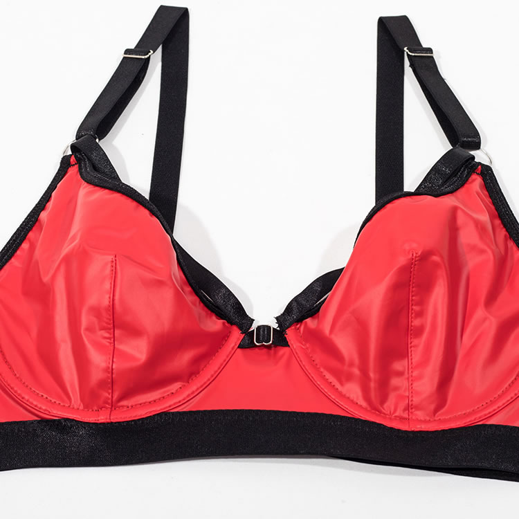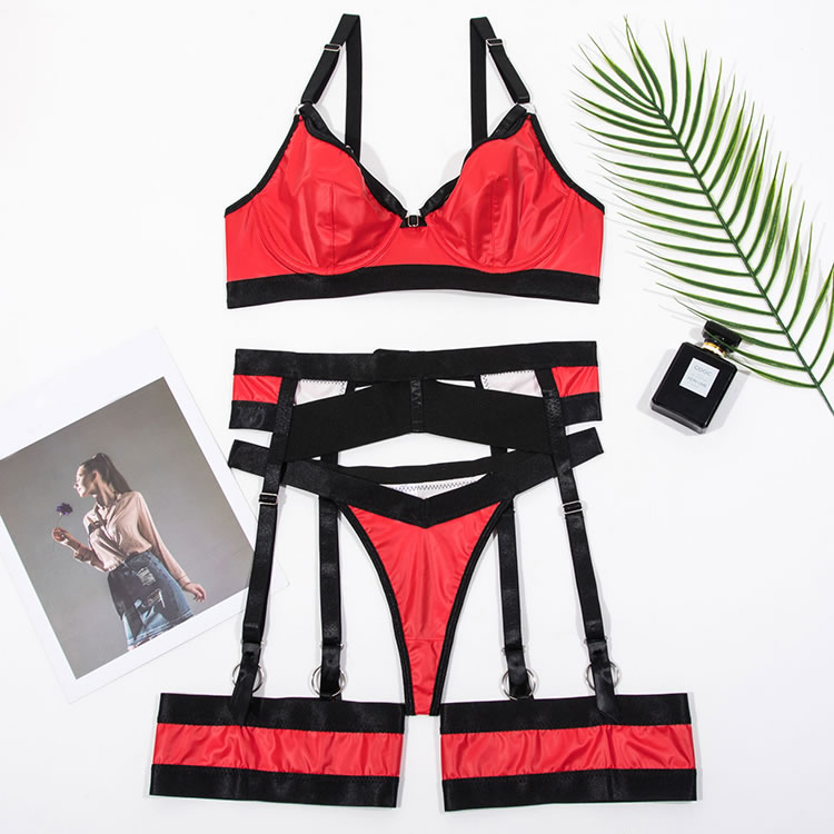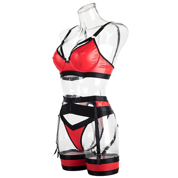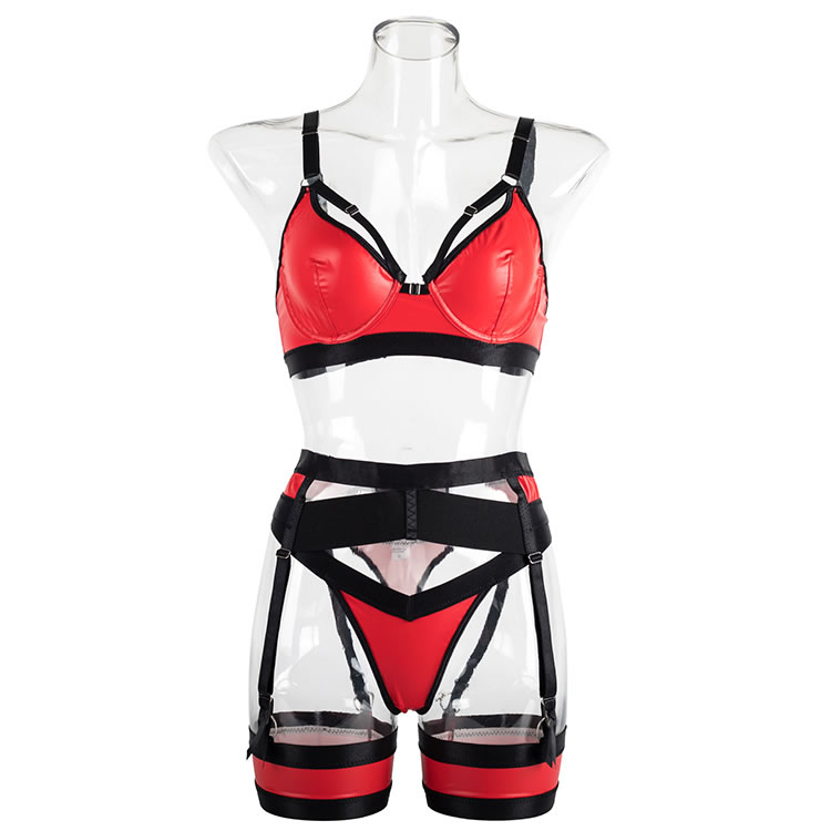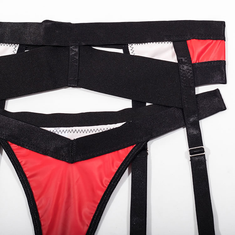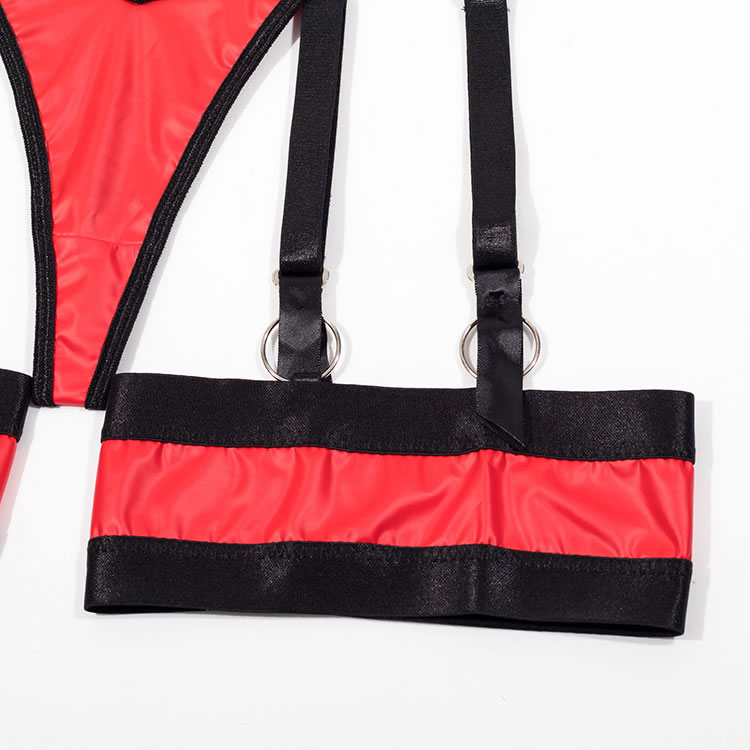 Ignite passion with this bold red and black lingerie set. This eye-catching ensemble features a molded, underwire bra in a vibrant, wet-look red, accented with sleek black straps for a modern, edgy feel. The matching high-waisted garter belt and thong continue the striking color-block design, with multiple adjustable straps that create a captivating caged effect. Complete with matching thigh bands, this set is designed to make a powerful and unforgettable statement.