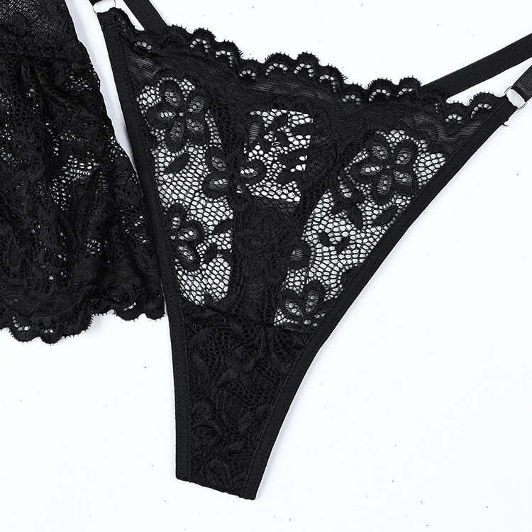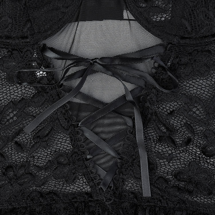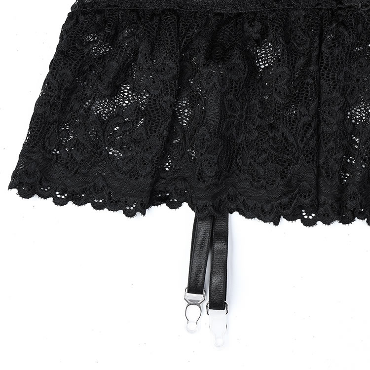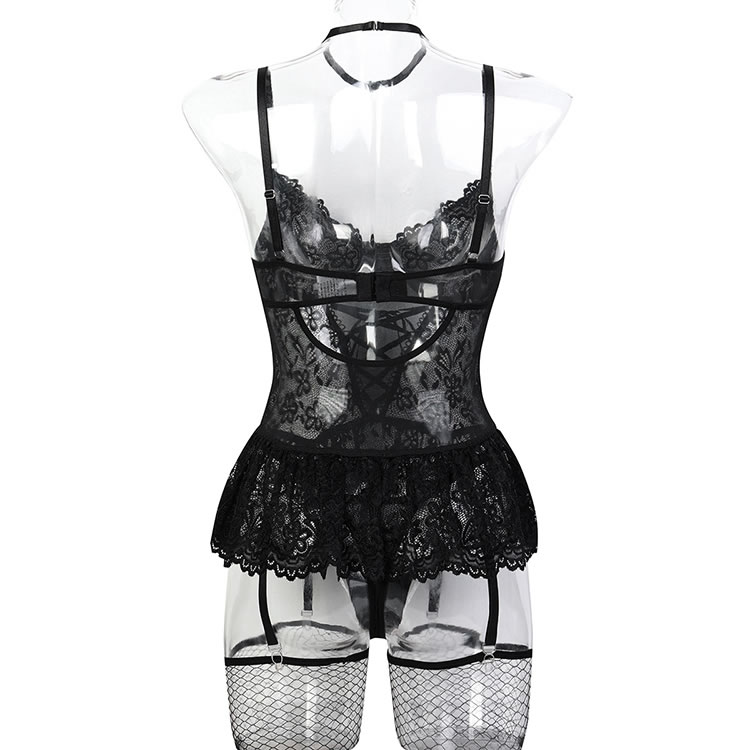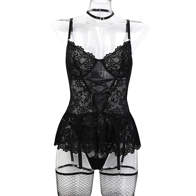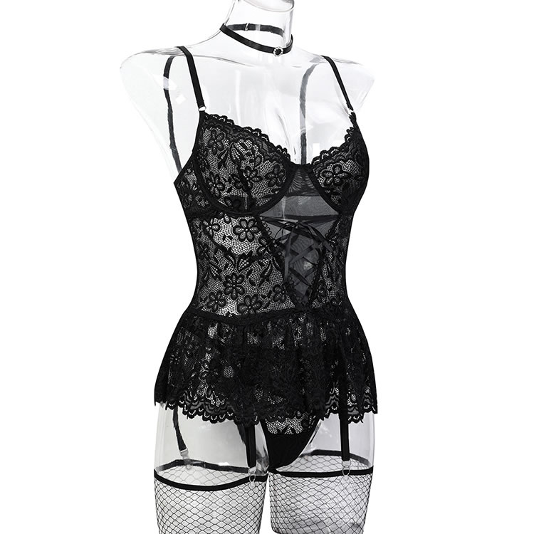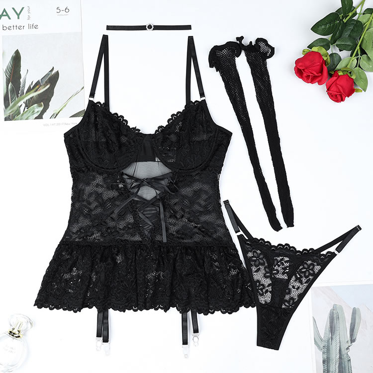 Turn heads in this seductive babydoll set featuring sheer lace underwire cups, adjustable spaghetti straps, and a hook and eye back closure with a keyhole. The sheer lace bodice with lace-up detailing adds a sultry touch, while adjustable garter straps, a matching choker, thong panty, and thigh-high stockings complete the irresistible look.